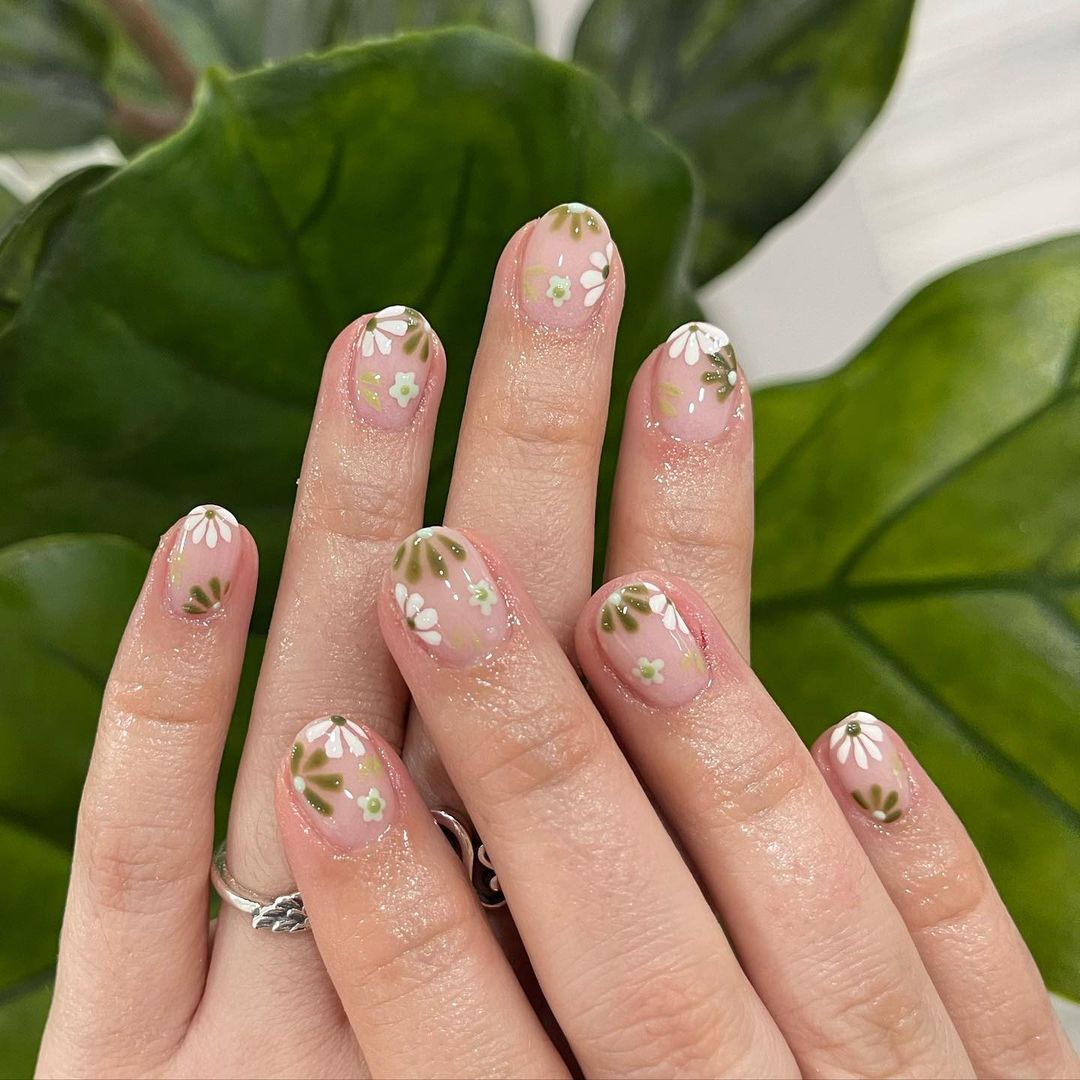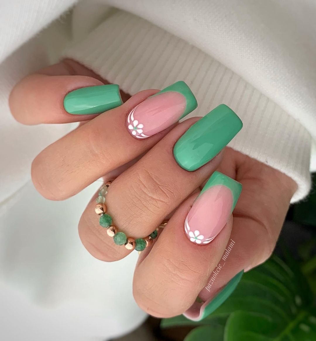 Весна у многих ассоциируется с оттенками зеленого, поэтому вы можете выбрать этот цвет в качестве основного для маникюра, а один или два ногтях оставить полупрозрачными. На них можно нанести узоры и же рисунки в виде ромашек.