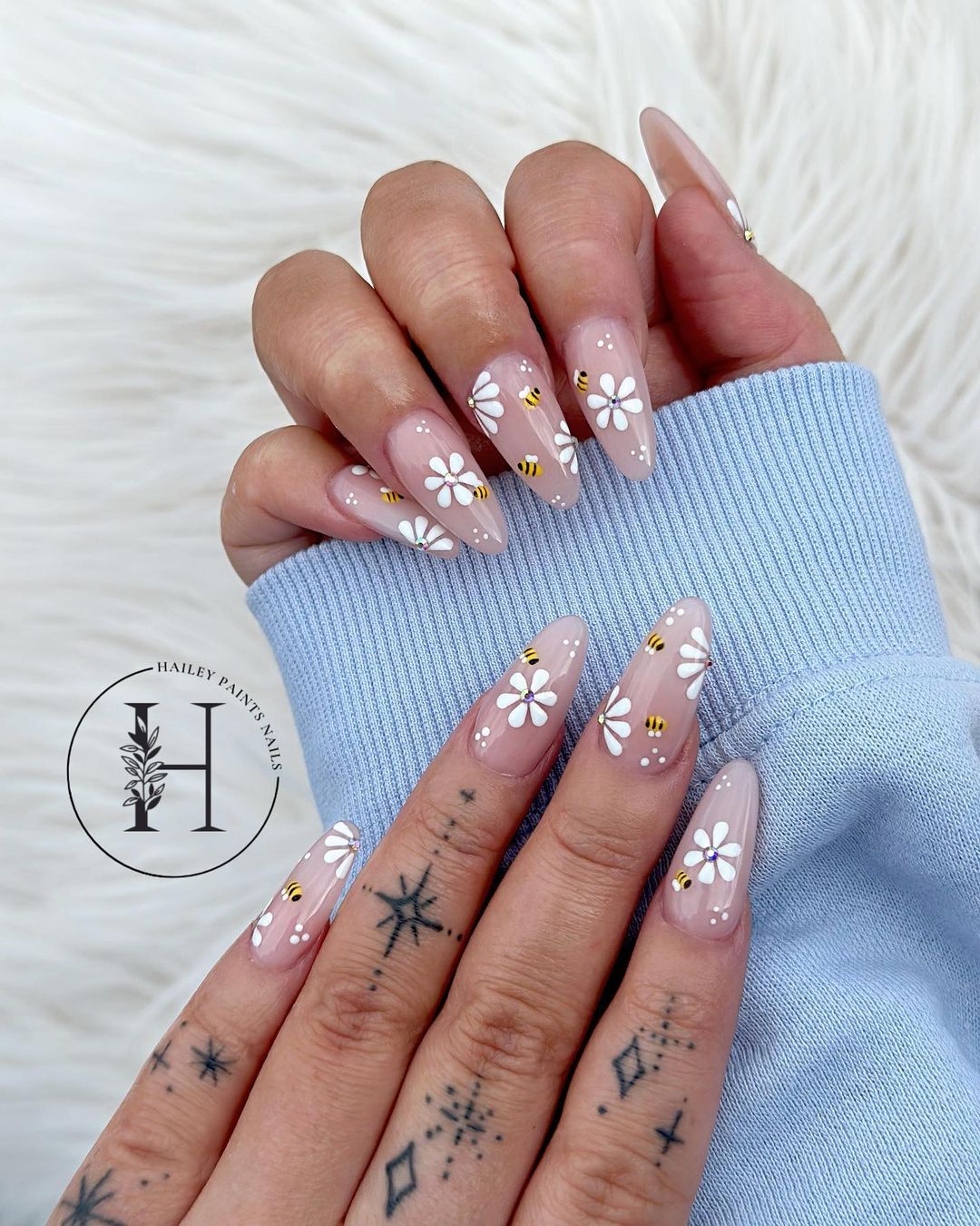 Если вы – обладательница длинных ногтей миндалевидной формы, сделайте нежный маникюр, покрыв ногти бежевым или розовым полупрозрачным гель-лаком. Разнообразить их можно рисунками милых пчел и ромашками.