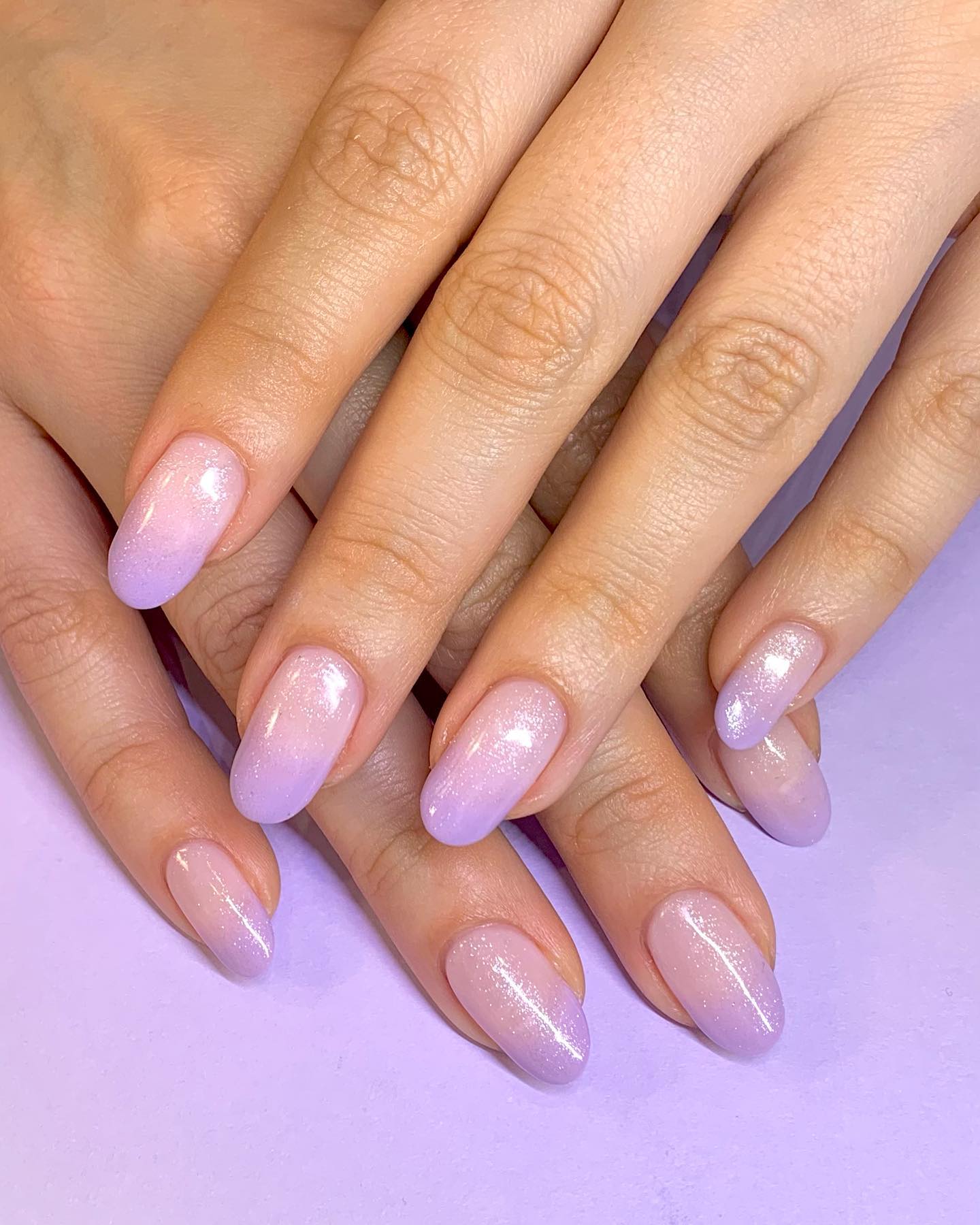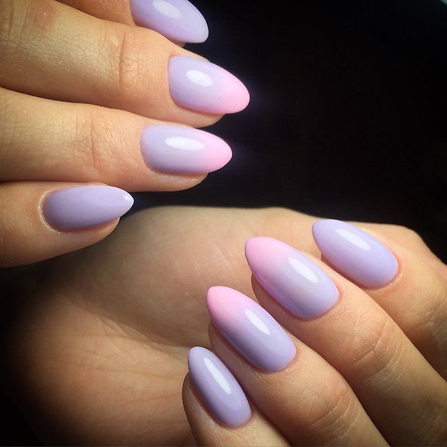 Еще один вариант дизайна – сделать лавандовый маникюр в технике омбре – то есть с плавным переходом одного цвета к другому. Вы можете сочетать лавандовый оттенок с пастельным или же розоватым, а также покрыть сверху мелкими шиммерными блестками.