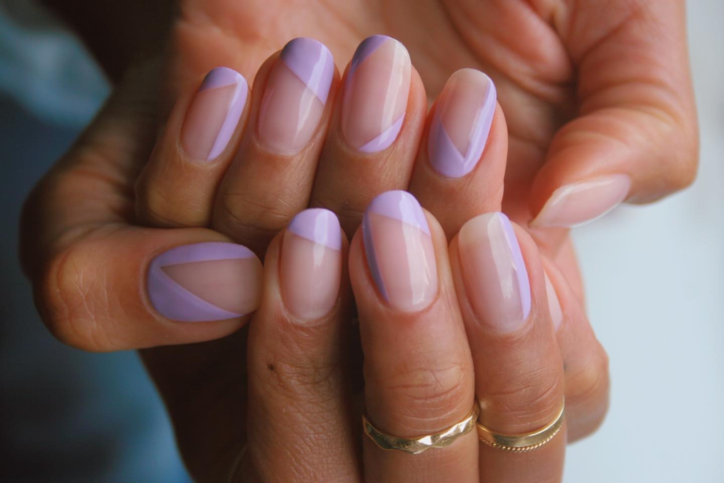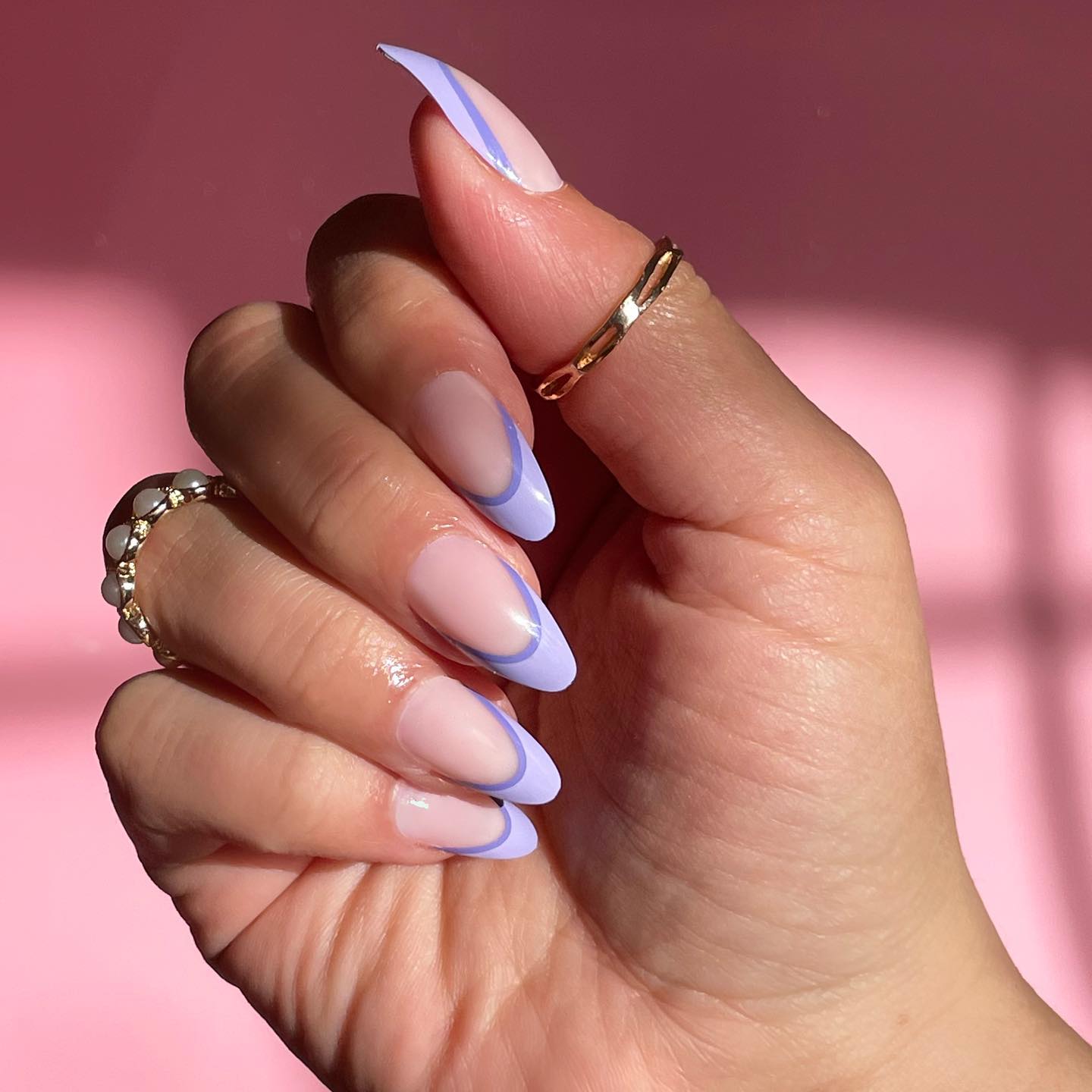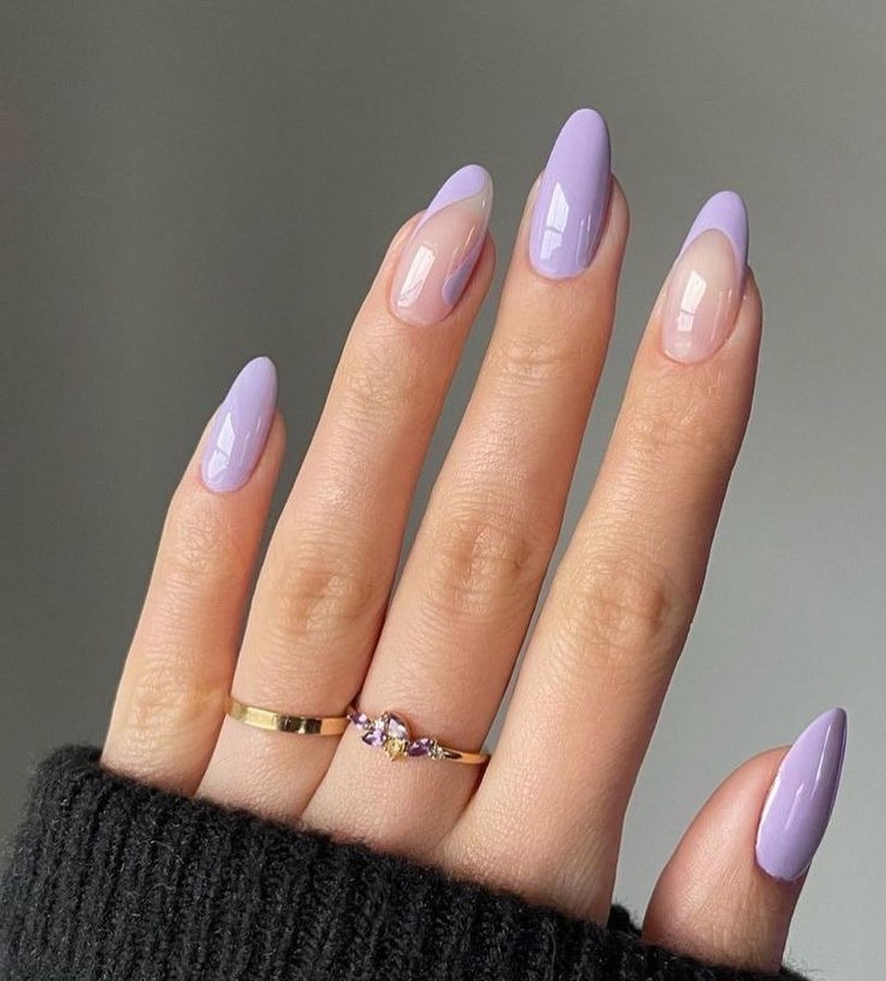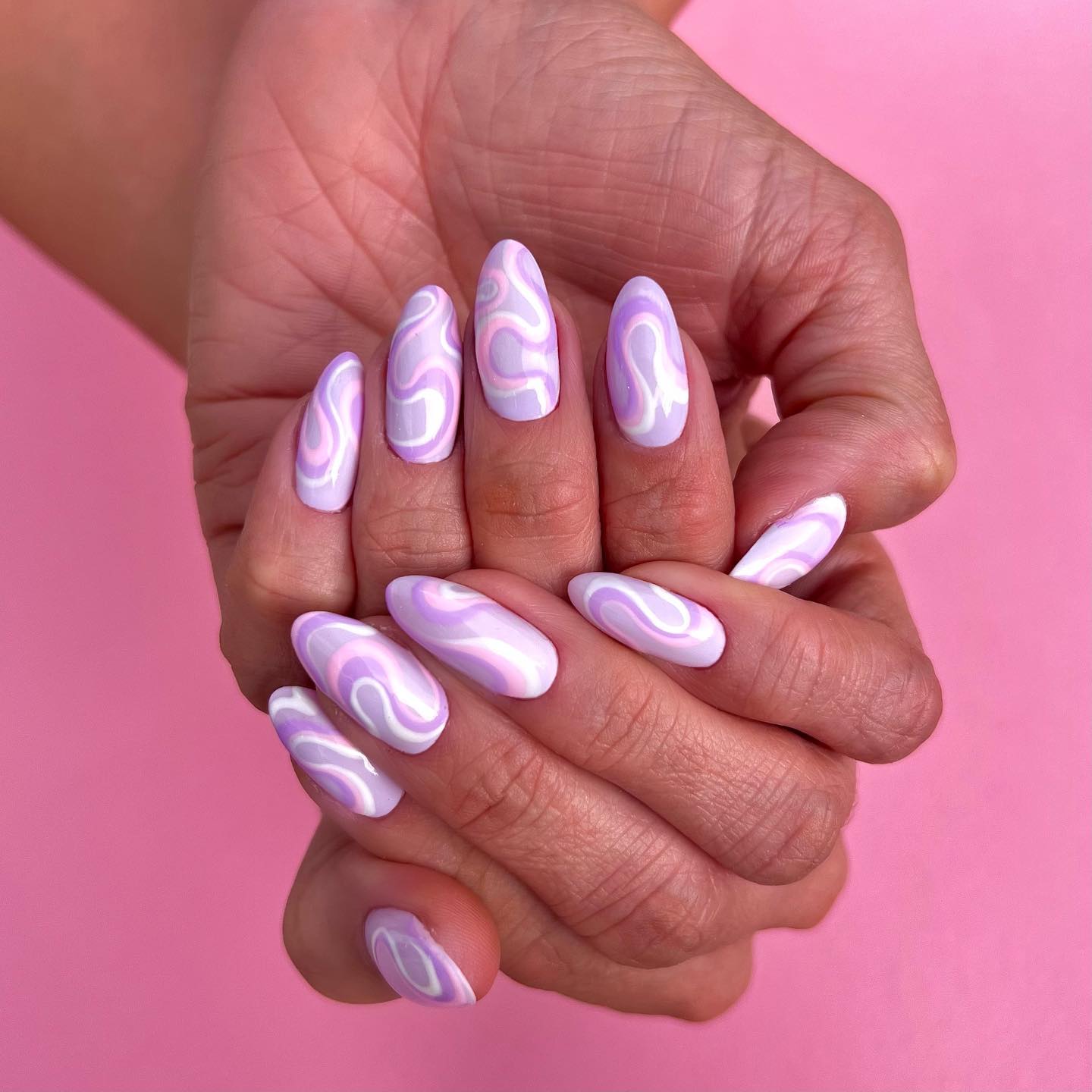 Или же сделать волнистый дизайн. Такой трендовый маникюр с волнистыми линиями можно выполнить не только, сочетая несколько пастельных оттенков, но в фиолетовой гамме. Особенно красиво такой дизайн будет смотреться на длинных ногтях миндалевидной формы.