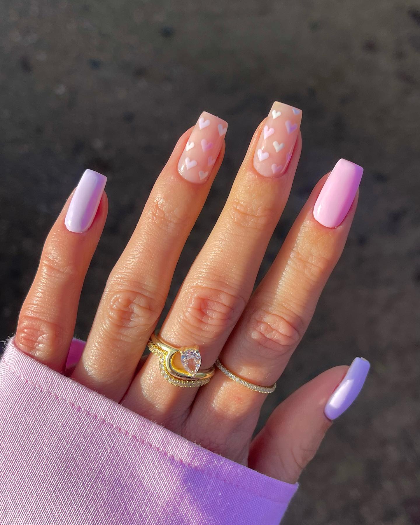 Дополнить лавандовый маникюр можно стемпингом – то есть перенесением на ноготь при помощи штампа рисунка с трафарета. Например, это могут быть изображения сердечек или же любые абстракции, лиственные или цветочные узоры.