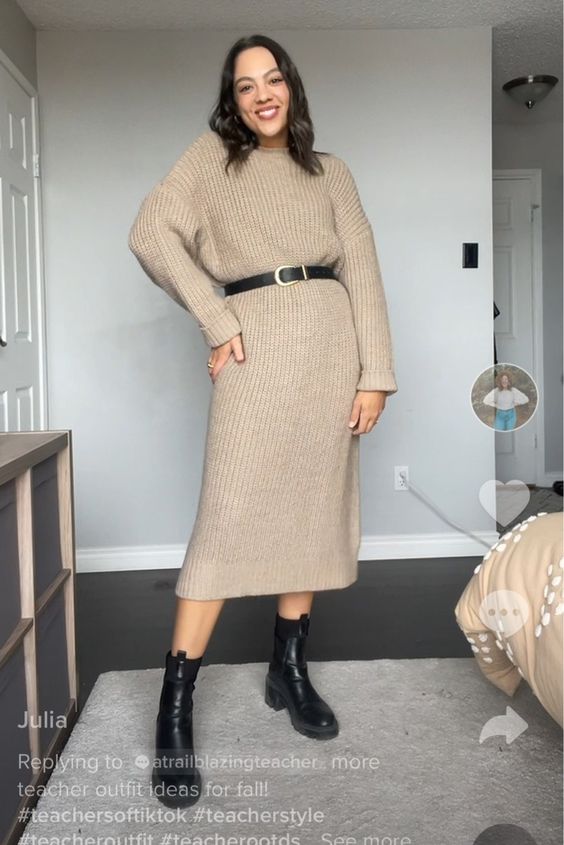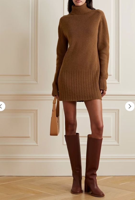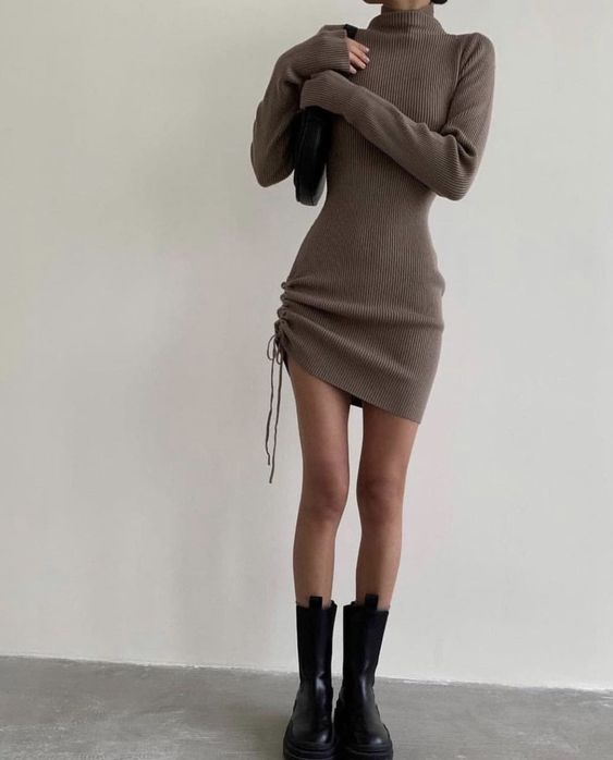 Тем модницам, кто может похвастаться точеной фигурой, можно присмотреть теплое платье в длине мини. Дополните лук ботинками челси или же высокими сапогами на каблуках.