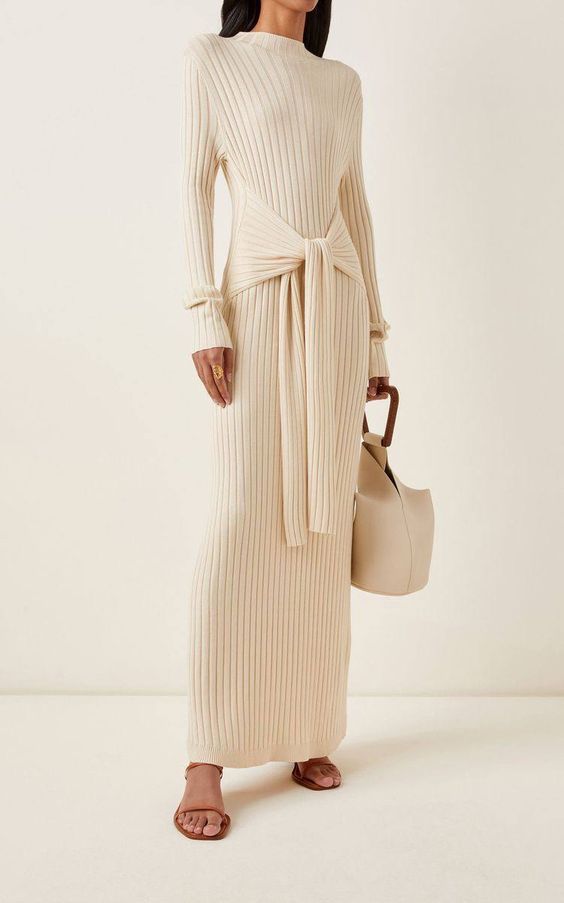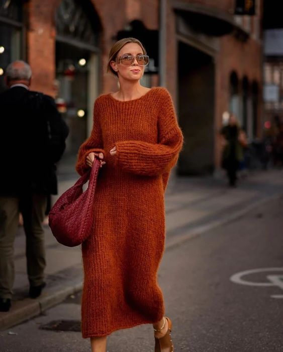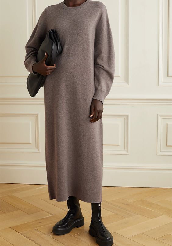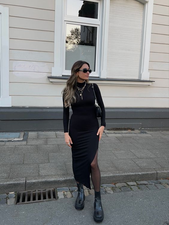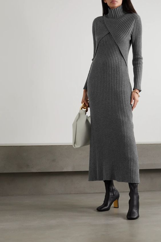 Чтобы подчеркнуть свою женственность, можно присмотреть теплое платье с глубоким разрезом или двумя разрезами, которые выгодно подчеркнут стройные ноги. Дополните такой лук сапогами на высоких каблуках, небольшой сумкой и стеганым пальто или накиньте сверху массивный свитер.