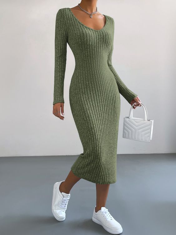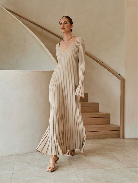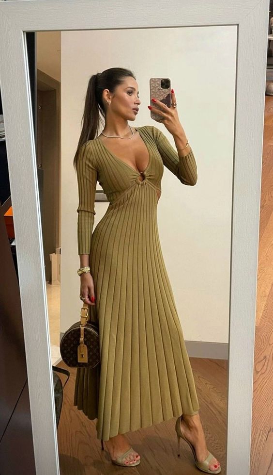 Для праздничных мероприятий или романтических свиданий присмотрите теплое платье с V-образным вырезом в зоне декольте, чтобы подчеркнуть его, а также визуально удлинить шею. Носить его можно как с обувью на высоких каблуках, так и с удобными кроссовками.