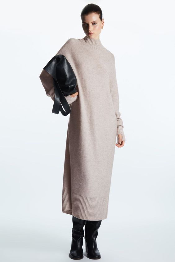 Для самых холодных дней можно подобрать трикотажное платье-водолазку с высоким горлом. Оно может быть как приталенным, так и свободного кроя или же оверсайз. Сочетать такую модель можно как с сапогами с высоким голенищем, так и с грубыми ботинками на тракторной подошве.