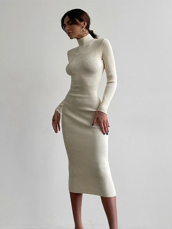 Еще один вариант – теплое платье прямого кроя. Его можно дополнить тонким ремнем, чтобы визуально подчеркнуть талию, или же носить с пиджаком. Выбирайте базовые цвета: белый, молочный, бежевый, серый и черный, с которыми легче составить стильные комбинации.