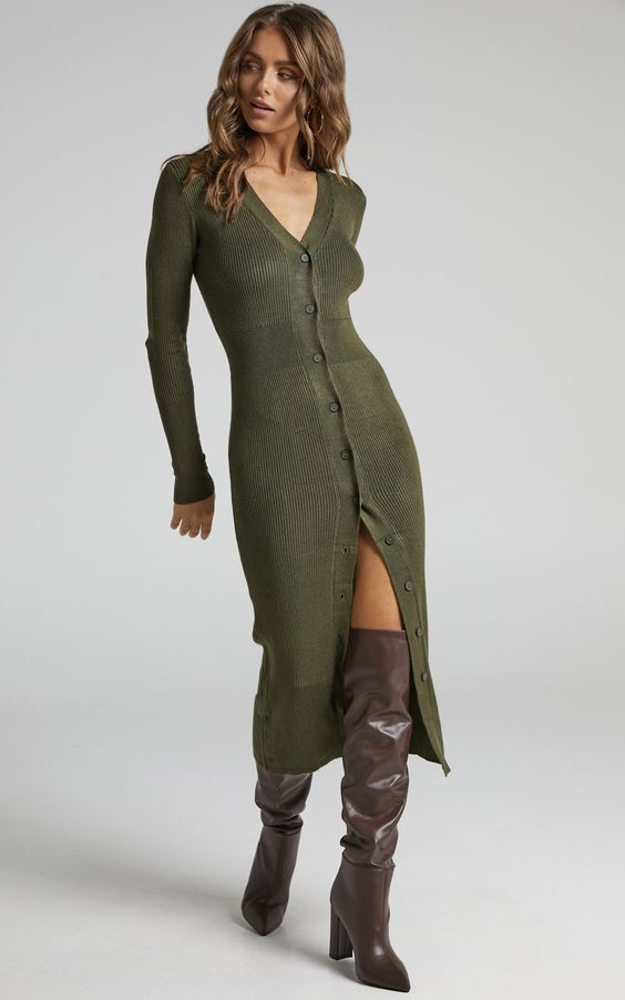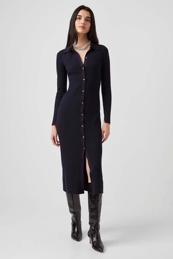 Также в тренде трикотажные платья в рубчик с пуговицами спереди. Такой вариант подойдет как для офиса, если у вас нет строгого дресс-кода, так и для свидания или вечеринки. Дополните такой наряд высокими сапогами или ботфортами.