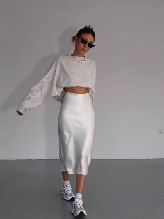 Юбку миди можно сочетать и со спортивной одеждой и обувью. Например, создайте повседневный образ с атласной юбкой, толстовкой и удобными кроссовками.
