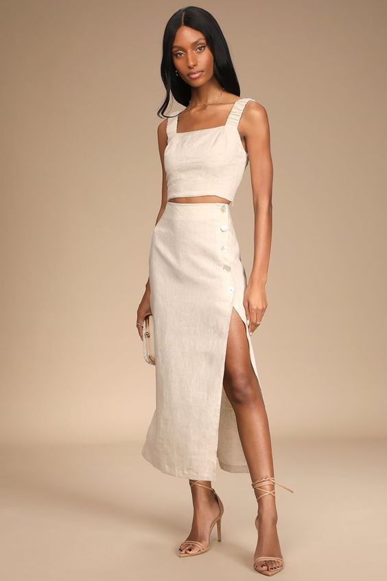 Также на лето можно присмотреть юбку миди из льна и носить ее с разными топами и блузками. Это универсальный вариант на жаркую погоду – следует только дополнить образ соответствующей обувью и аксессуарами.