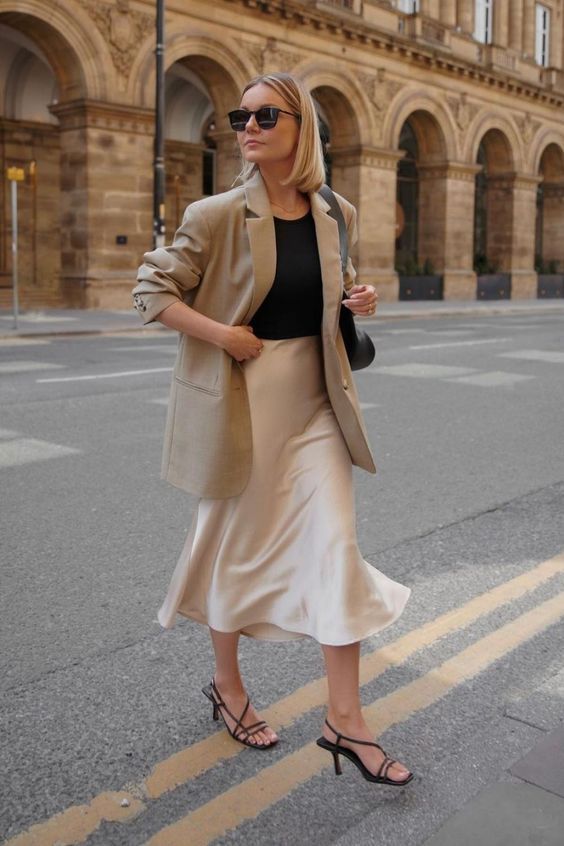Для похода на деловую встречу подойдет образ с юбкой в длине миди бежевого оттенка, черным топом и пиджаком оверсайз светло-коричневого оттенка. Дополните образ небольшой сумкой и открытыми босоножками.