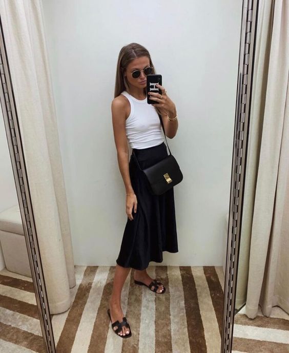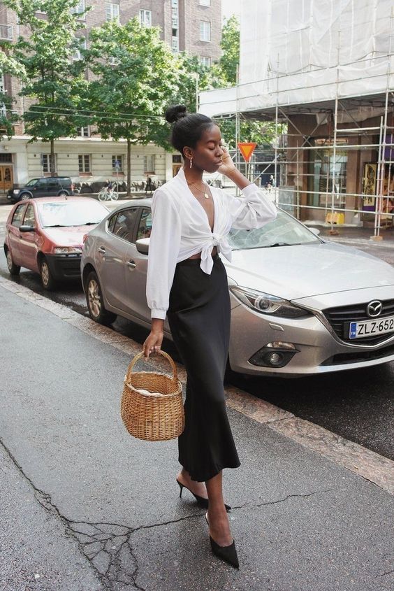 Для более расслабленного лука надевайте черную юбку миди из атласа или шелка, белую майку и шлепанцы на плоском ходу, а для похода в офис подойдет образ с юбкой, блузой и туфлями на каблуках.