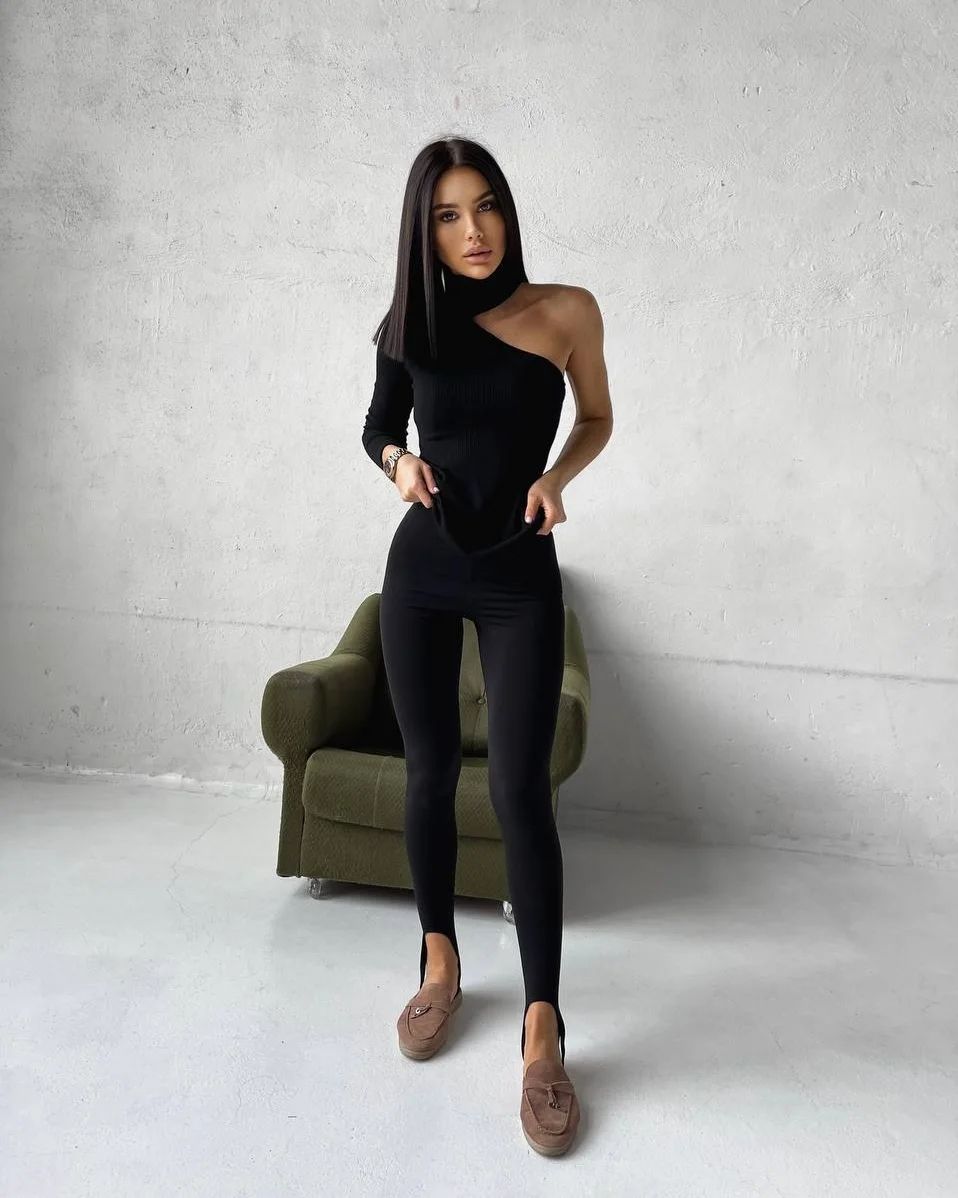 Еще один тренд сезона – леггинсы со штрипками. Надевайте их с водолазкой на одно плечо и ассиметричным вырезом, а также с лоферами или мюлями. Дополните лук маленькой сумкой и отправляйтесь на встречу с подругами.