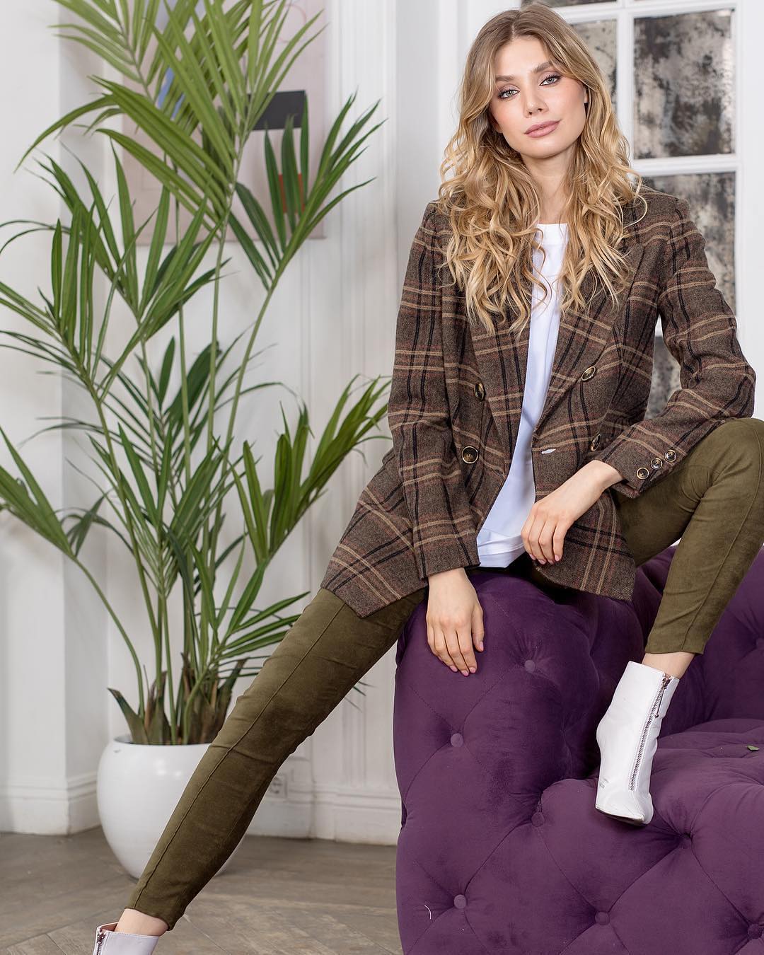 Для стильного офисного лука подберите замшевые леггинсы со стрелкой впереди. Надевайте их с белой блузой, пиджаком оверсайз и ботильонами на каблуках. Дополните образ сумкой в классическом стиле.