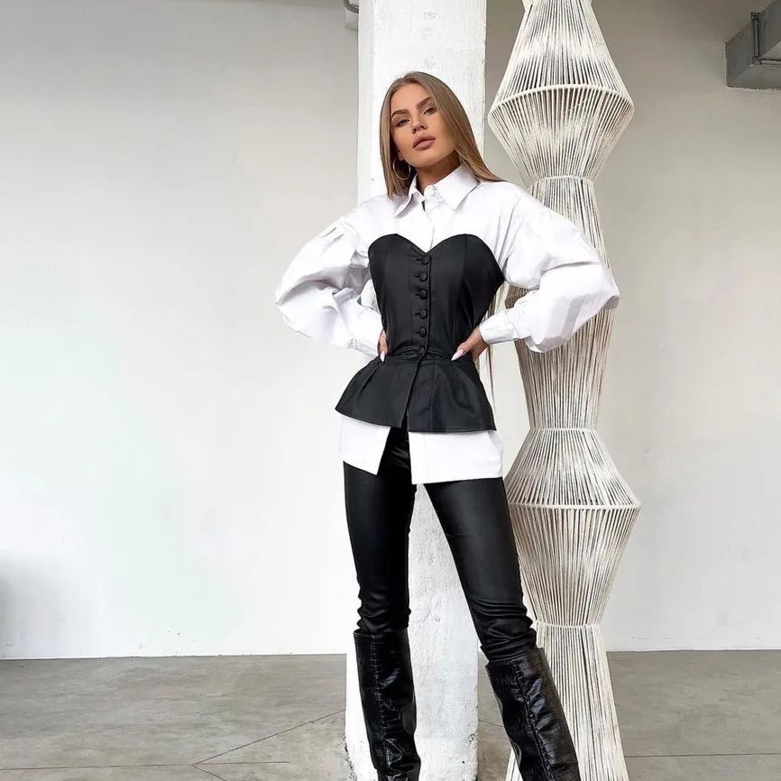 Для создания стильного образа надевайте черные леггинсы из эко-кожи, белую рубашку с объемными рукавами и сверху – корсет. Дополните лук высокими сапогами из кожи рептилии, небольшим клатчем и пальто. В нем вы можете отправиться на светское мероприятие или романтический ужин.