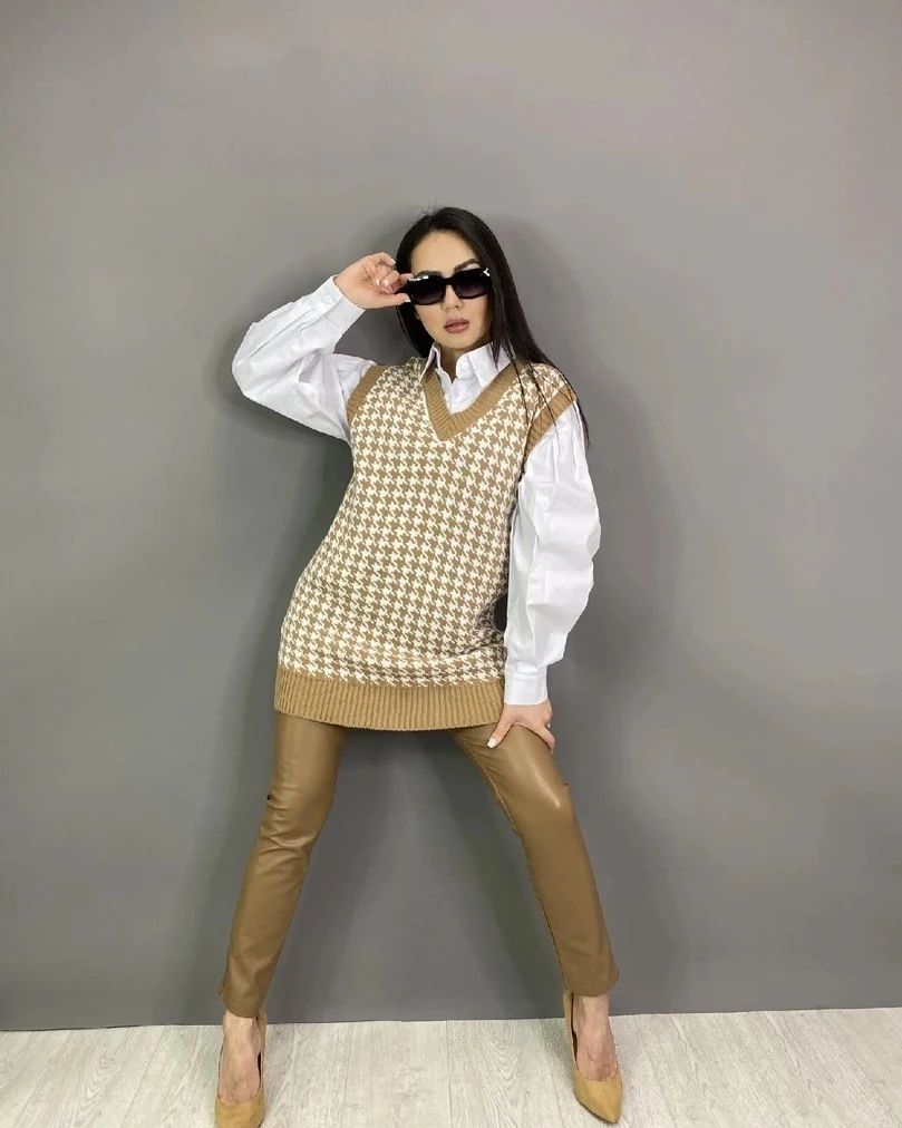 Еще один вариант на весну – горчичные леггинсы из эко-кожи. Надевайте их с блузой, удлиненным жилетом с принтом "в гусиную лапку" и туфлями-лодочками. Дополните образ контрастной сумкой.