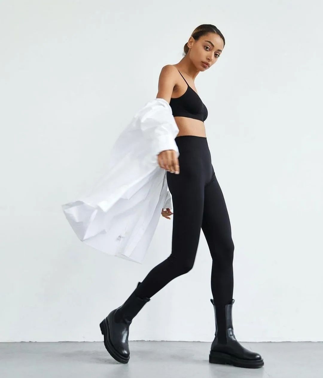 С черными леггинсами можно создать как деловой образ, надев их с белой рубашкой и ботинками-челси, так и спортивный – дополнив их топом и удобными кроссовками.