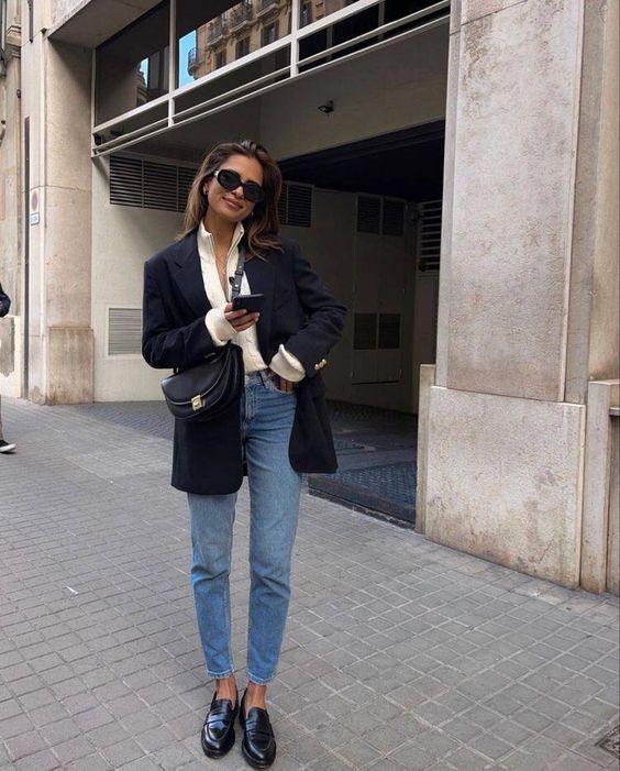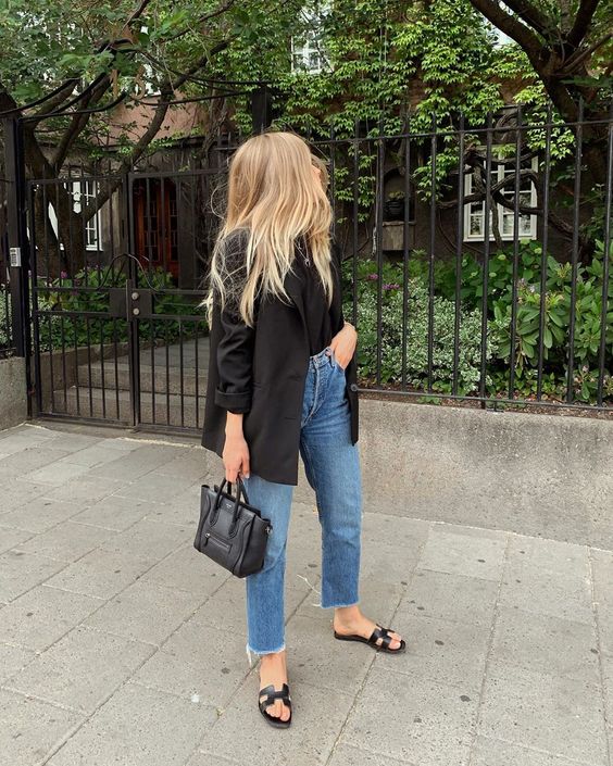 Также можно поэкспериментировать и надеть под джинсы шлепанцы на низком ходу. Создайте стильный лук: синие джинсы прямого кроя, черные футболка и пиджак оверсайз, а также классическая сумка и шлепанцы.