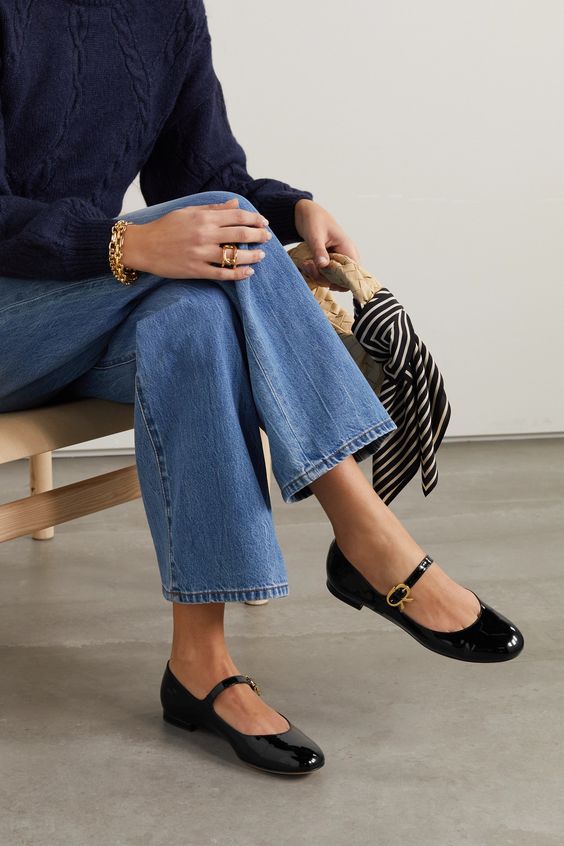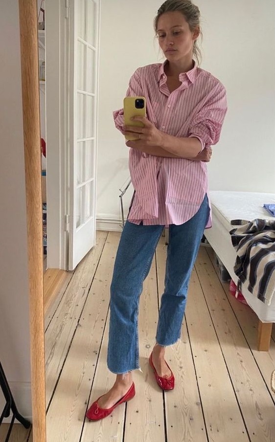 Также джинсы хорошо сочетаются с балетками – классической моделью женской обуви с закрытым носком на плоской подошве или с маленьким устойчивым каблуком. Надевайте брюки из денима прямого кроя, рубашку в клетку и балетки яркого цвета, а дополнить лук можно сумкой-шопером.