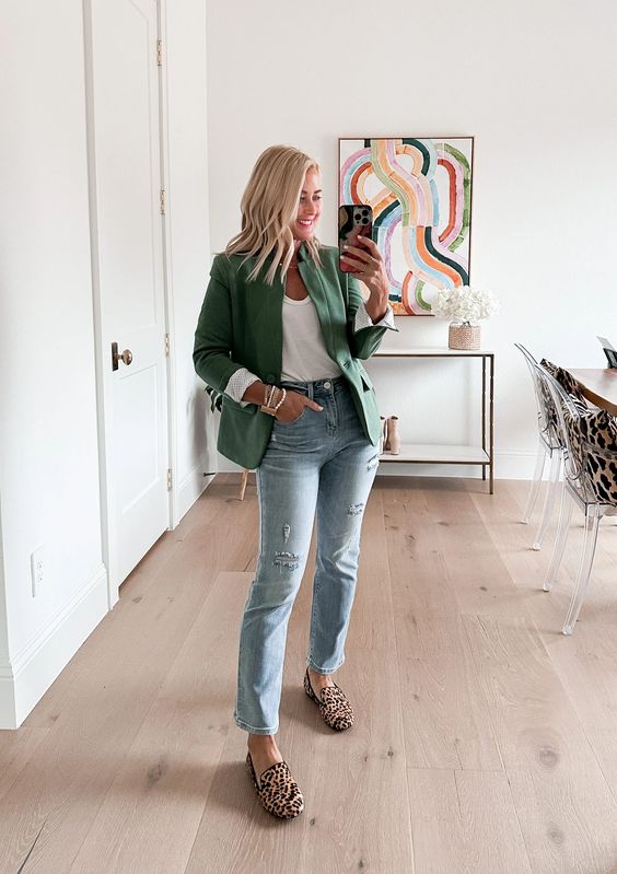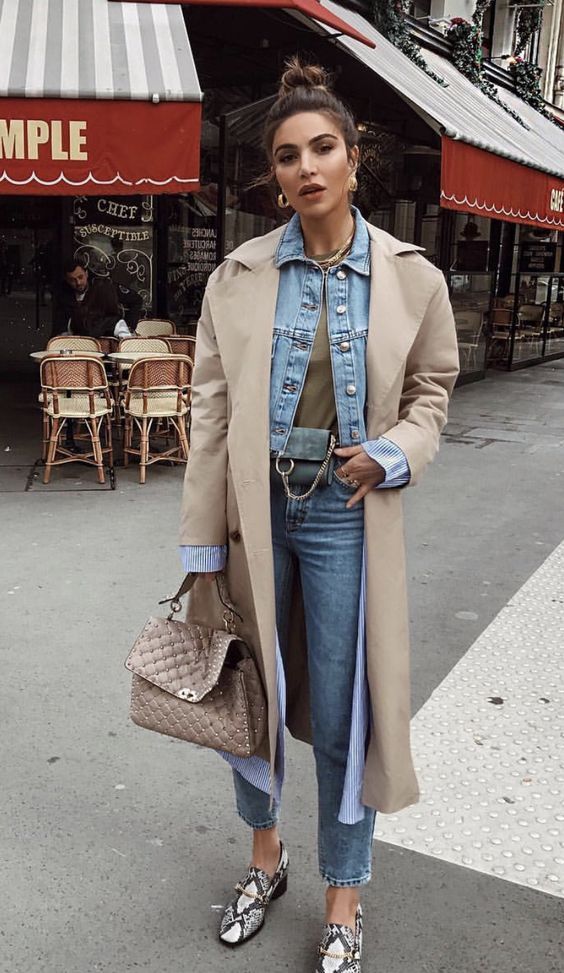 Для стильных повседневных луков выбирайте лоферы. Это может быть как классическая модель из черной кожи, так и вариант из искусственной кожи с животным принтом. Надевайте любимые джинсы, белую рубашку, пиджак оверсайз, джинсовую куртку или же бежевый тренч. Дополните образ клатчем или вместительной сумкой.