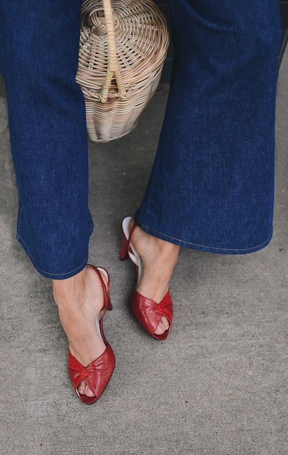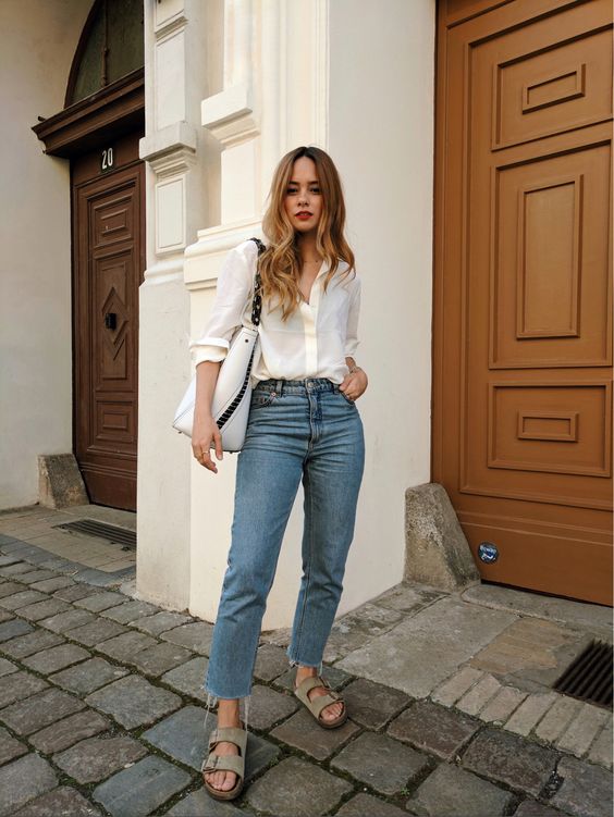 Летом джинсы также можно сочетать с босоножками на небольшом каблуке. Подберите под любимую модель штанов из денима трендовый фасон открытой обуви и дополните образ топом, блузкой и сумкой.