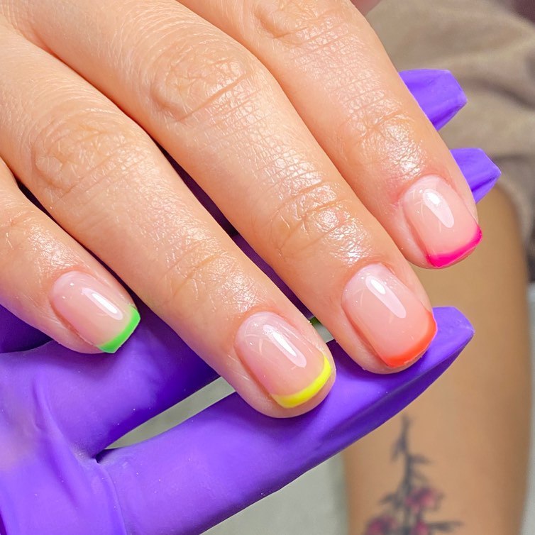 А тем модницам, которые соскучились за зиму по ярким краскам, советуем сделать необычный разноцветный френч. Основу ногтя покрываем полупрозрачной базой, а на каждый кончик наносим новый оттенок.