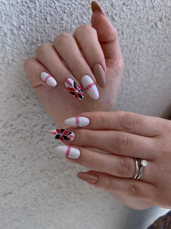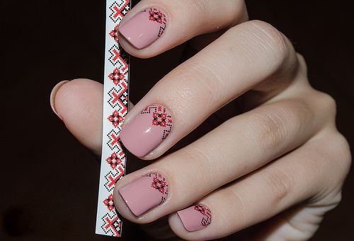 Еще один вариант украинского маникюра – с узором вышиванки. Основная цветовая гамма классической украинской вышиванки – черные и красные нити на белом фоне. Однако при желании их можно разбавить и другими яркими оттенками.