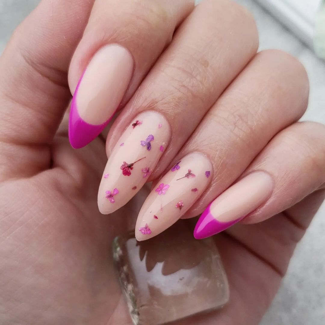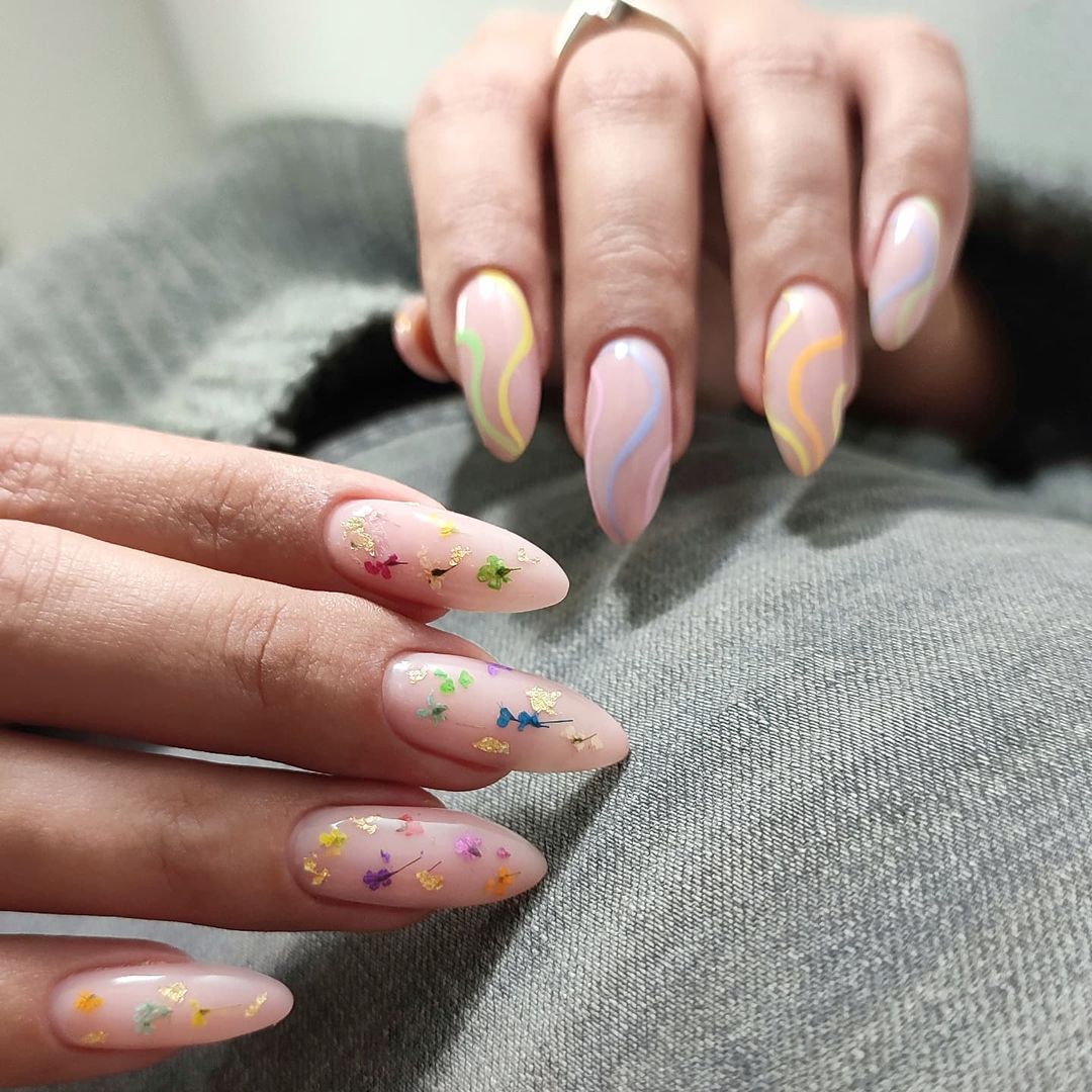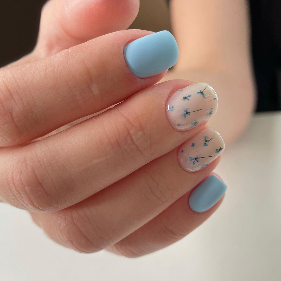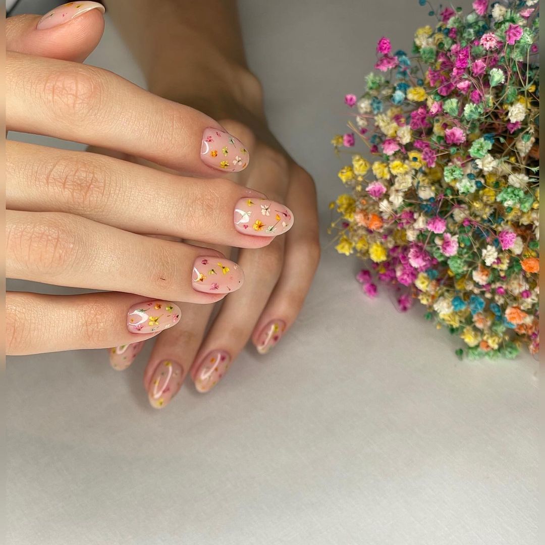Маникюр с такими элементами смотрится очень нежно и женственно и подойдет как для вечеринки, так и для повседневного варианта. Такой дизайн красиво смотрится и на коротких, и длинных ногтях. Например, для коротких ногтей можно выбрать нюдовый оттенок лака и украсить один ноготь сухоцветами. Или же покрыть все ногти прозрачным гель-лаком, а дополнить его сухоцветами разного цвета.