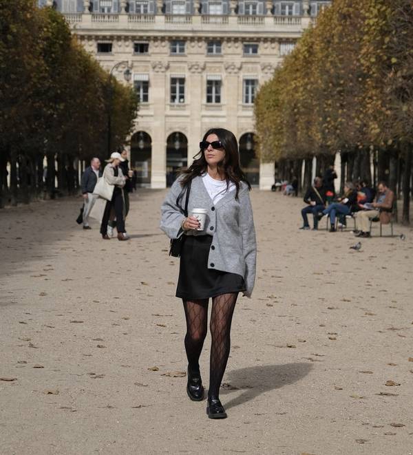 Для более теплых весенних дней подойдет лук, состоящий из черной короткой юбки, белой блузки оверсайз, серого кардигана на пуговицах, а также полупрозрачных капроновых колготок с узором и классических лоферов. Дополните образ рюкзаком или вместительной сумкой-шопером.
