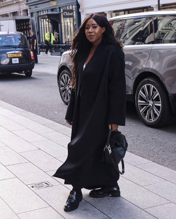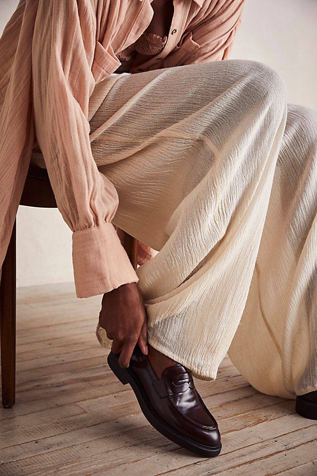 Лоферы идеально подойдут для деловых образов в офис. Надевайте костюм или блузу и длинную юбку, а сверху накиньте пальто-халат. Дополнят образ классические лоферы и кожаная сумка.