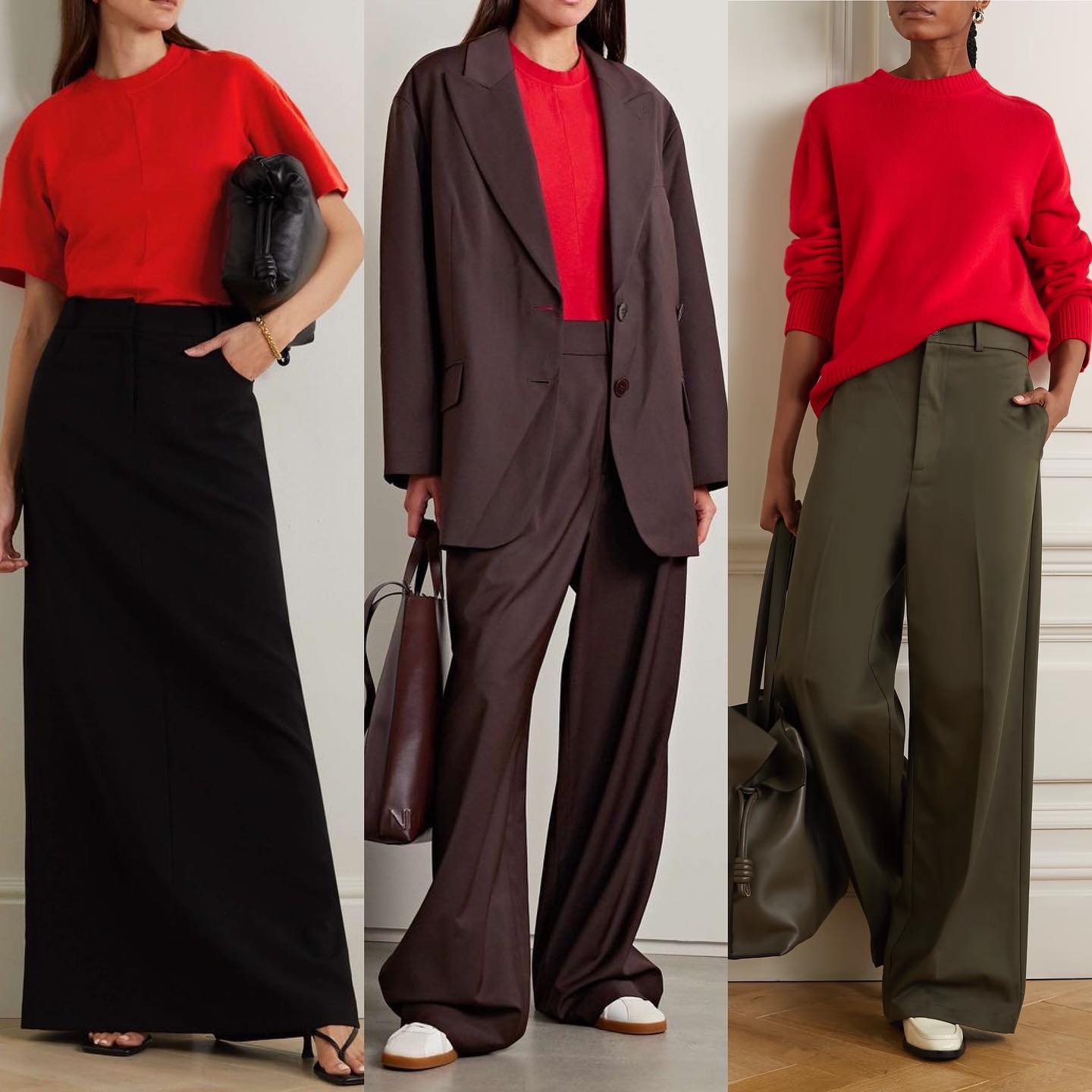 Также можно подобрать верх в красном оттенке – это может быть блуза, лонгслив, гольф-водолазка или свитер, и низ контрастного цвета, например, черного, коричневого или хаки.