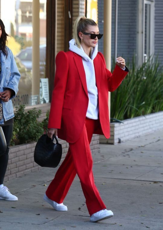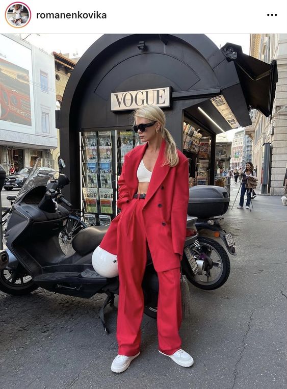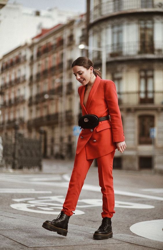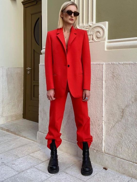 Также на осень можно присмотреть брючный костюм ярко-алого оттенка. При этом пиджак и штаны можно дополнить как классическими туфлями, так и грубыми ботинками на тракторной подошве или же удобными кедами.