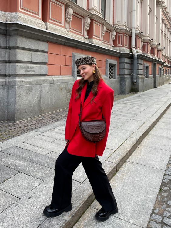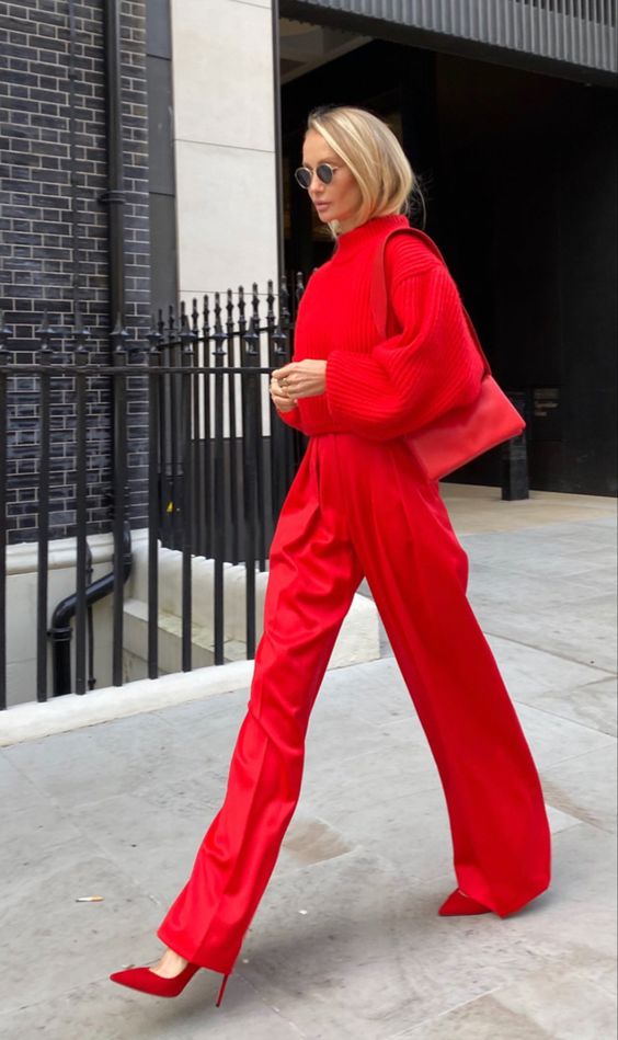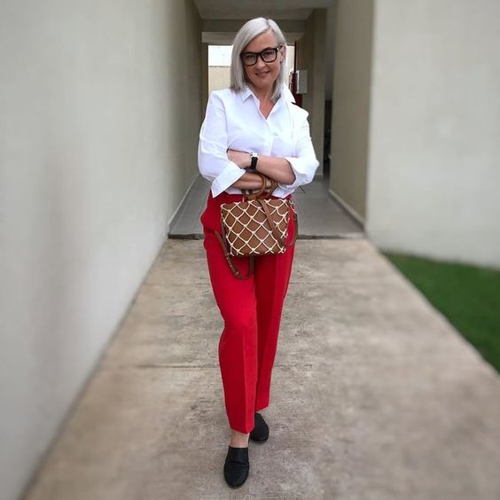 Также можно сыграть на контрасте и выбрать красный низ. Надевайте белую блузу, ярко-алые штаны прямого кроя и черную обувь. Сумку можно подобрать в тон к основным оттенкам или же выбрать нейтральную (бежево-коричневую).