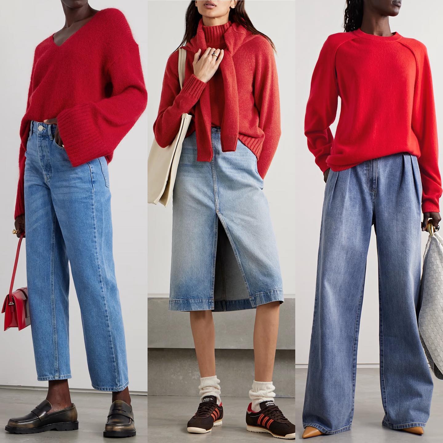 С красным верхом также сочетаются вещи из денима. Это может быть голубая джинсовая юбка с разрезом, штаны клеш или же укороченные джинсы.