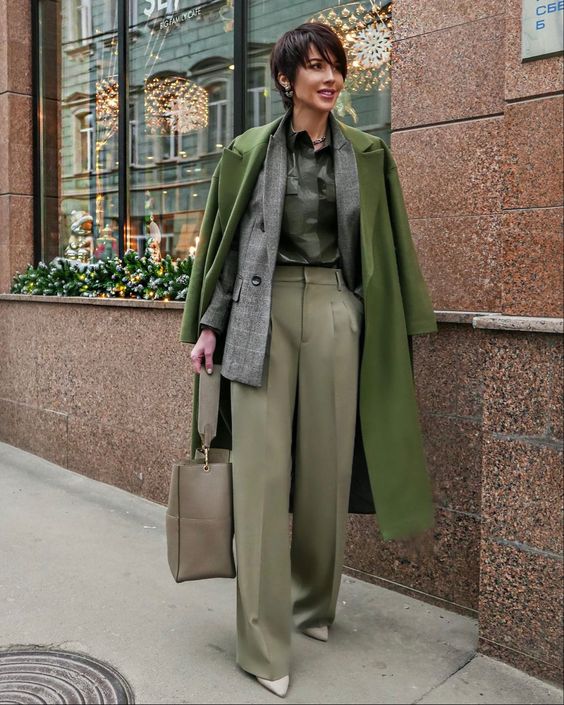 Для стильного делового лука выбирайте многослойный образ: широкие брюки со стрелками светло-оливкового оттенка, зеленая блузка, а поверх пиджак в клетку. Дополнят образ длинное пальто, обувь с острым носком на высоком каблуке и вместительная кожаная сумка.