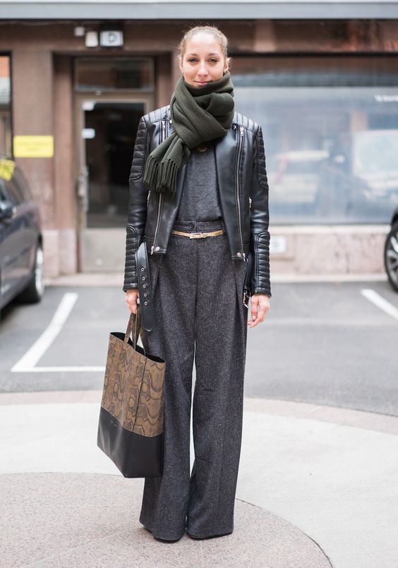 Еще один стильный вариант – широкие брюки, водолазка и кожаная короткая куртка. Дополнить лук можно аксессуарами: объемным шарфом, завязанным на шее, и сумкой-шоппером с животным принтом.