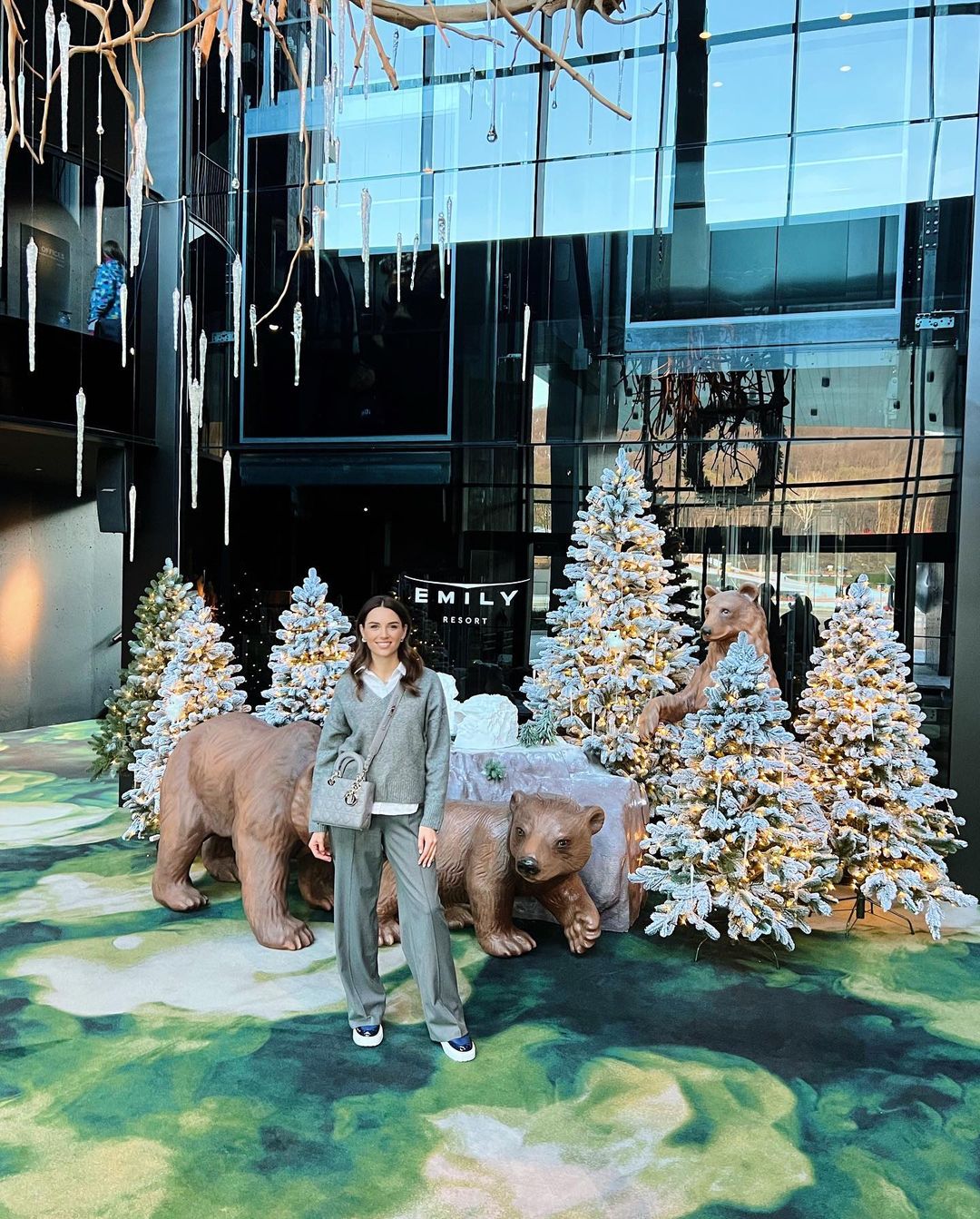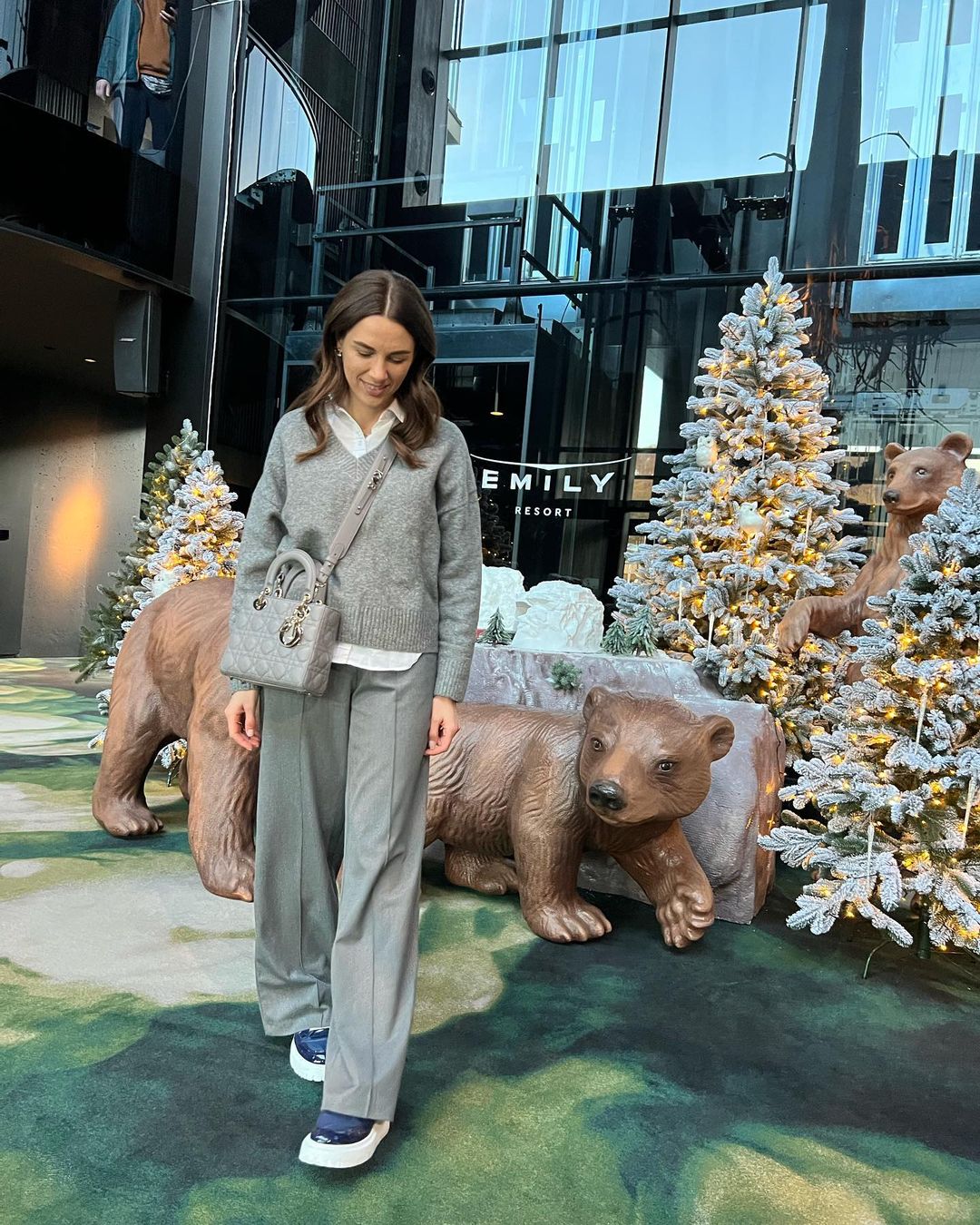 На этот раз она надела широкие брюки серого цвета со стрелками. Их она дополнила многослойным верхом: белой блузой и серым свитером с V-образным вырезом. Завершали образ темно-синие ботинки на белой массивной подошве и сумка-клатч известного бренда в тон ко всему образу, которую Кристина надела через плечо.