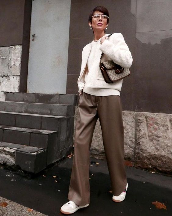 Для повседневного лука можно присмотреть широкие брюки из искусственной кожи насыщенного коричневого цвета. Надевайте их с белым лонгсливом и укороченным пиджаком, а также небольшой сумкой и удобной обувью. Дополните образ украшениями.
