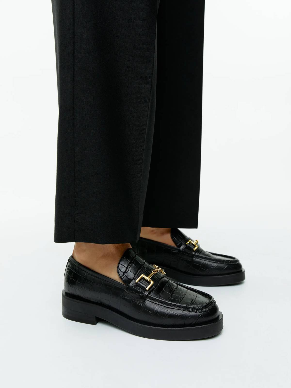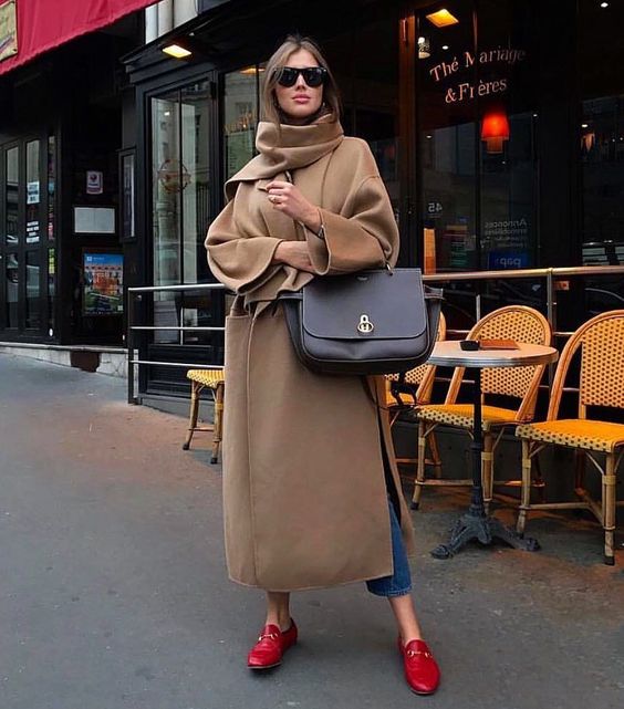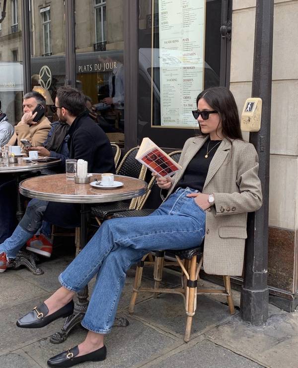 С туфлями-лоферами можно создать огромное количество стильных образов. Для повседневного лука присмотрите классическую модель с пряжкой. Надевайте синие джинсы с высокой линией талии, черный лонгслив и бежевый пиджак оверсайз в клетку. Дополните образ неброскими украшениями и сумкой-клатчем.