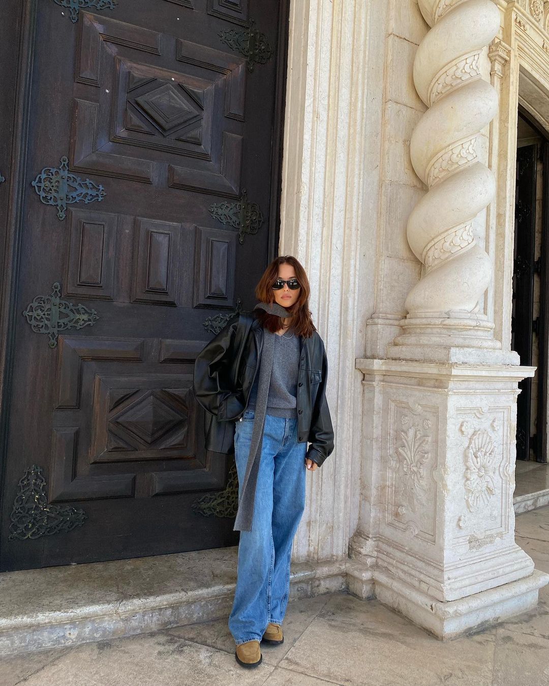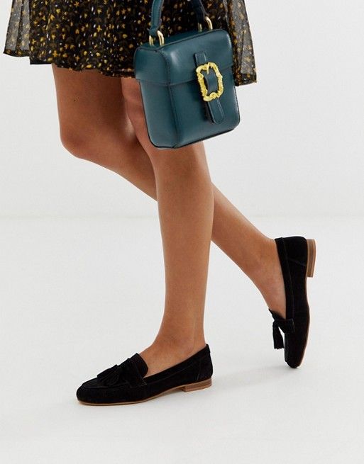 Еще один вариант на осень – замшевые лоферы. На осень можно присмотреть стильный лук, состоящий из голубых джинсов прямого или широкого кроя, серого джемпера, черной кожаной куртки или классического пиджака, а также замшевых лоферов песочного оттенка.