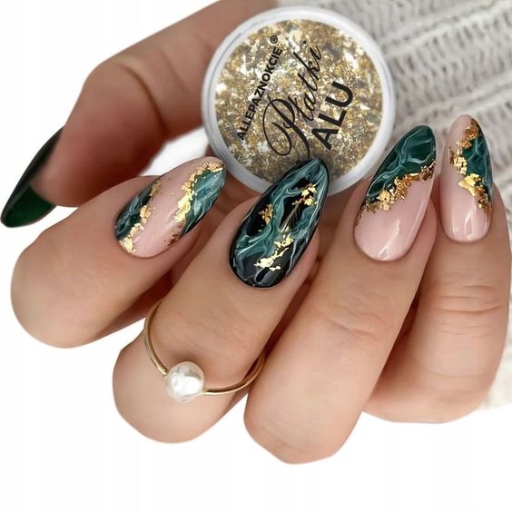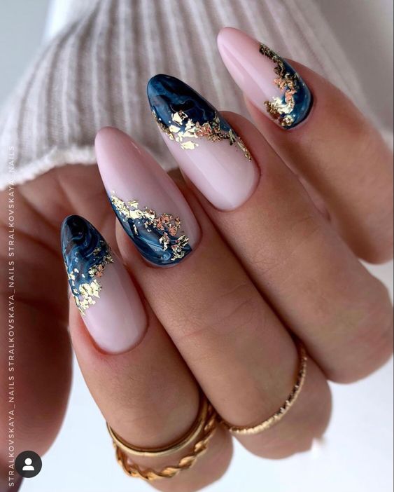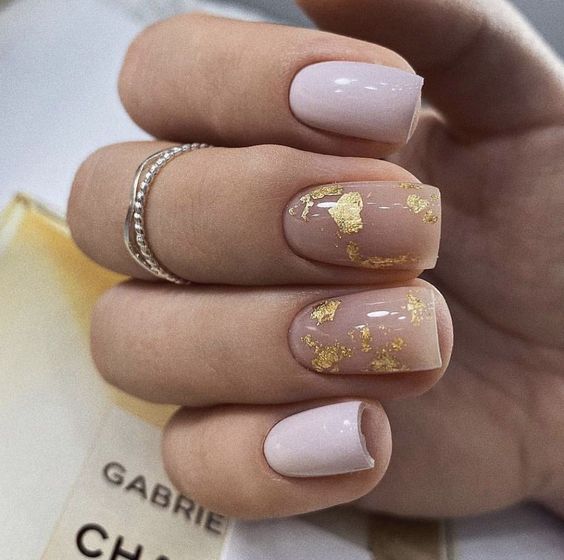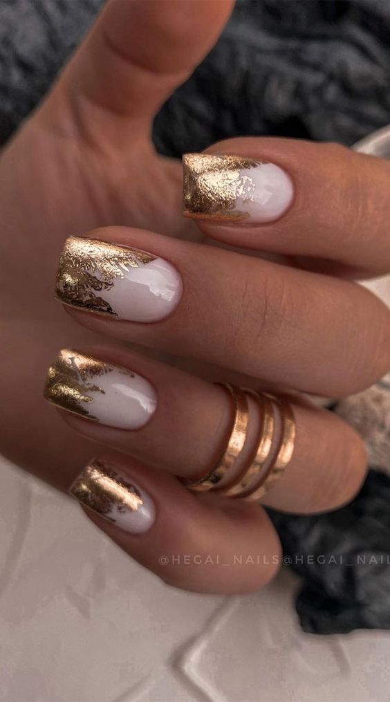 Еще одно стильное сочетание – мраморный маникюр с золотистой фольгой. Этот вариант дизайна имитирует поверхность камня с помощью размытого узора.