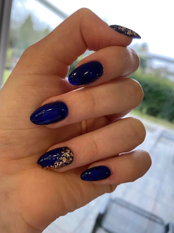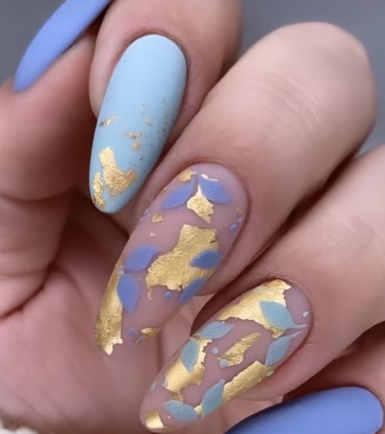 Также можно поэкспериментировать с матовым топом. Выбирайте яркие оттенки, например, голубой или фиолетовый, а дополнить такой маникюр можно кусочками фольги с золотыми элементами.