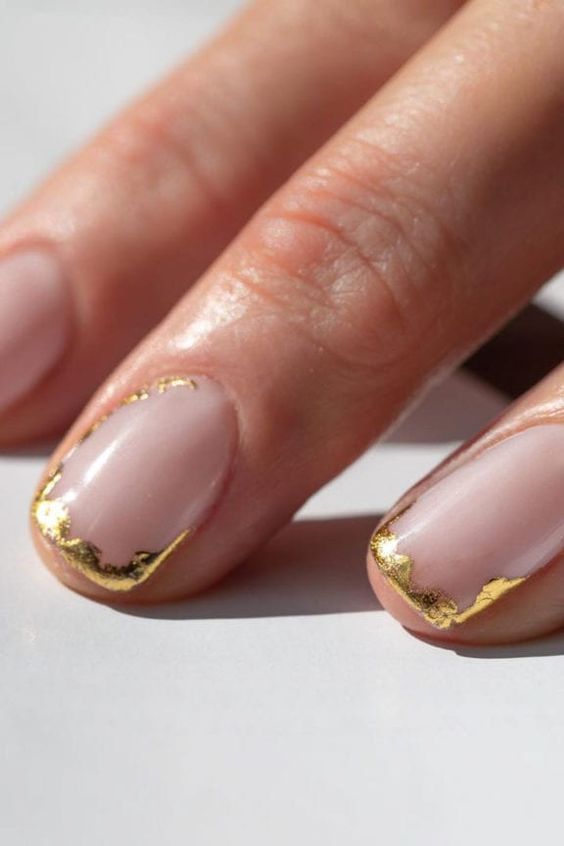 С помощью золотистой фольги можно сделать оригинальный вариант французского маникюра, который будет выглядеть на ногтях очень необычно. Дополнить такой дизайн можно горизонтальной линией золотистого оттенка.