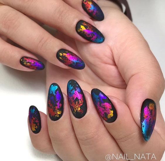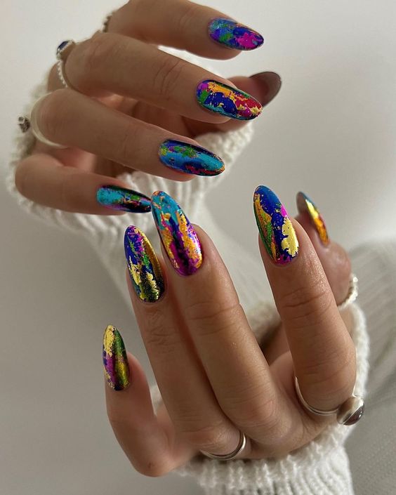 Можно выбрать несколько оттенков фольги и сделать с их помощью оригинальный разноцветный дизайн на длинных ногтях миндалевидной формы.