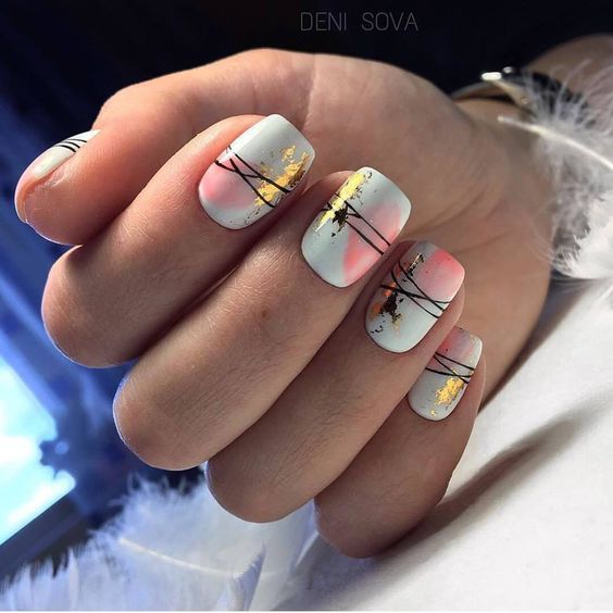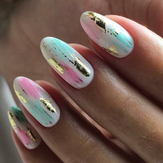 Если вы хотите выделиться из толпы, покройте ногти белым гель-лаком и сделайте на нем мазки розовым и бирюзовым оттенками. Дополните дизайн золотистой фольгой.