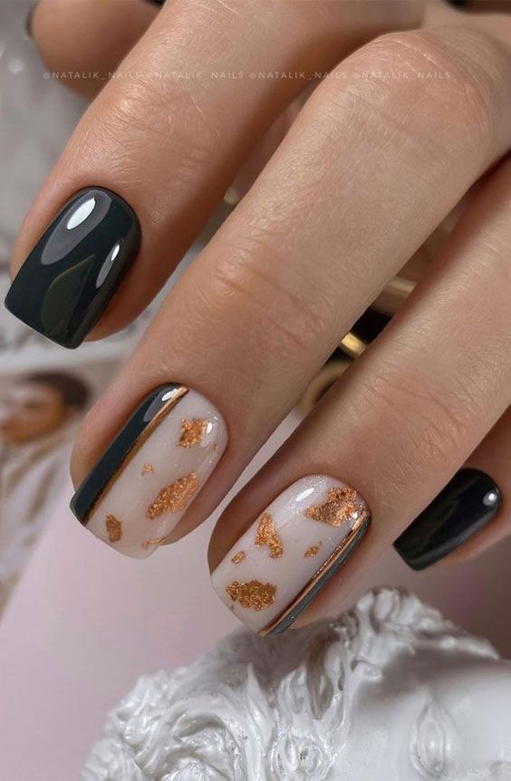 В одном маникюре можно совместить несколько цветов. Красиво будут сочетаться черный и белый, а дополнит их дизайн с золотистой фольгой.