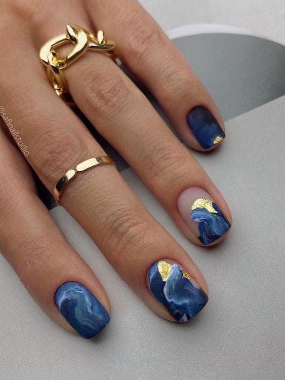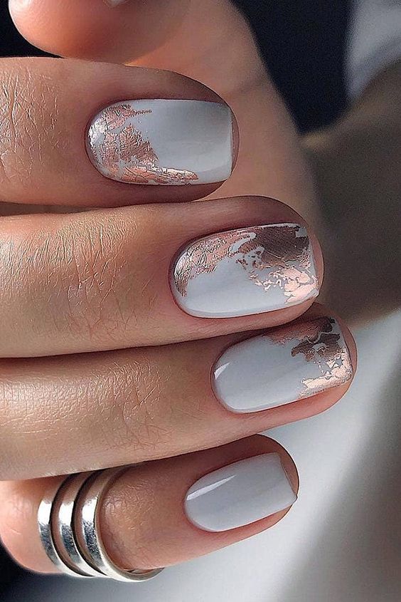 Также фольгой контрастного цвета можно разнообразить мраморный маникюр, который делают с использованием двух или более оттенков лаков.