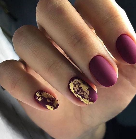 Также дизайн с фольгой будет красиво смотреться на однотонном матовом покрытии. Выбирайте насыщенный оттенок, а на одном или двух ногтях сделайте блики с помощью фольги.