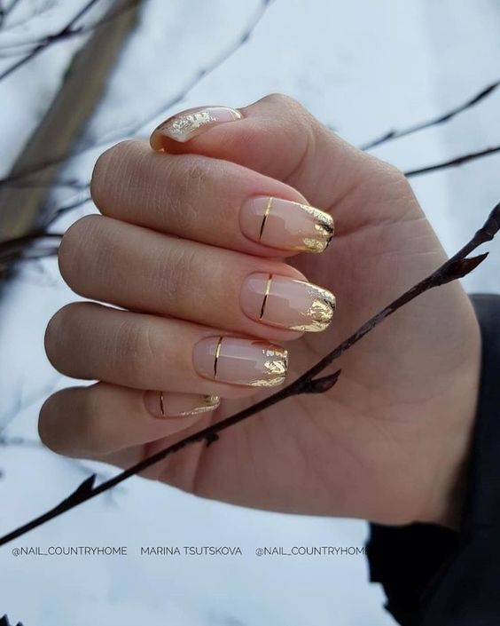 Еще один вариант – покройте ногти полупрозрачным гель-лаком, кончик ногтя украсьте золотистой фольгой, а посередине нарисуйте тонкую линию.