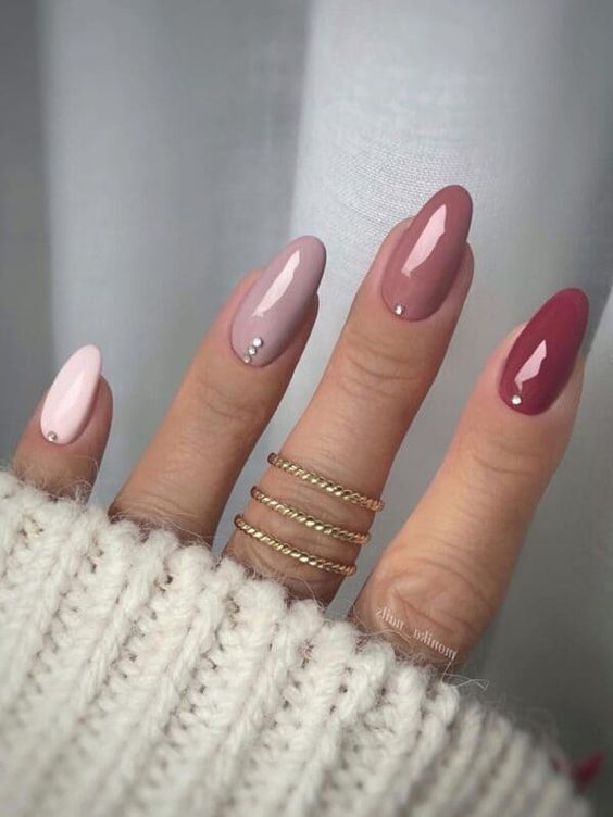 Также можно сделать необычный дизайн с градиентом, покрыв каждый ноготь похожим оттенком гель-лака. А дополнят его маленькие камешки на одном или нескольких ногтях.