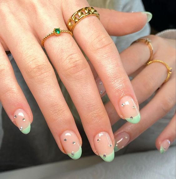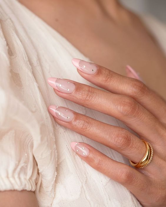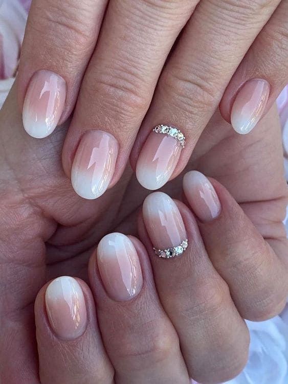 Также можно совместить в одном маникюре два нейл-арта: омбре и камешки. Маникюр омбре – это техника дизайна ногтей, которая включает в себя смешивание двух или более цветов для создания эффекта градиента. Как правило, используемые цвета относятся к одной цветовой гамме, с самым светлым оттенком у основания ногтя и постепенным затемнением к кончику.
